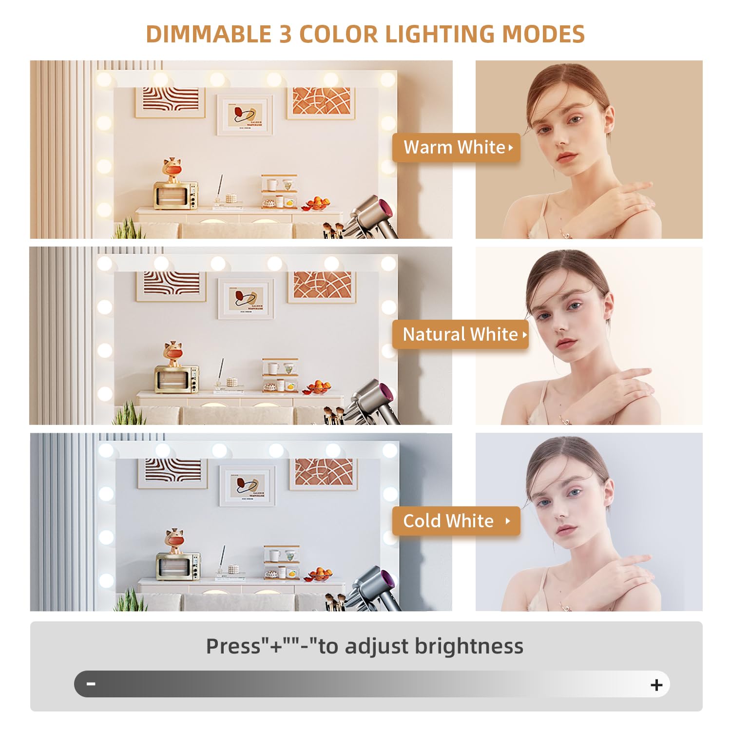 - 【HOLLYWOOD LIGHTED MIRROR】Features a large mirror with 14 bright Hollywood bulbs, VOWNER vanity desk provides 3 color modes (warm/natural/cool) and adjustable brightness to meet all your different makeup needs. Let's experience the star-like makeup treatment!
