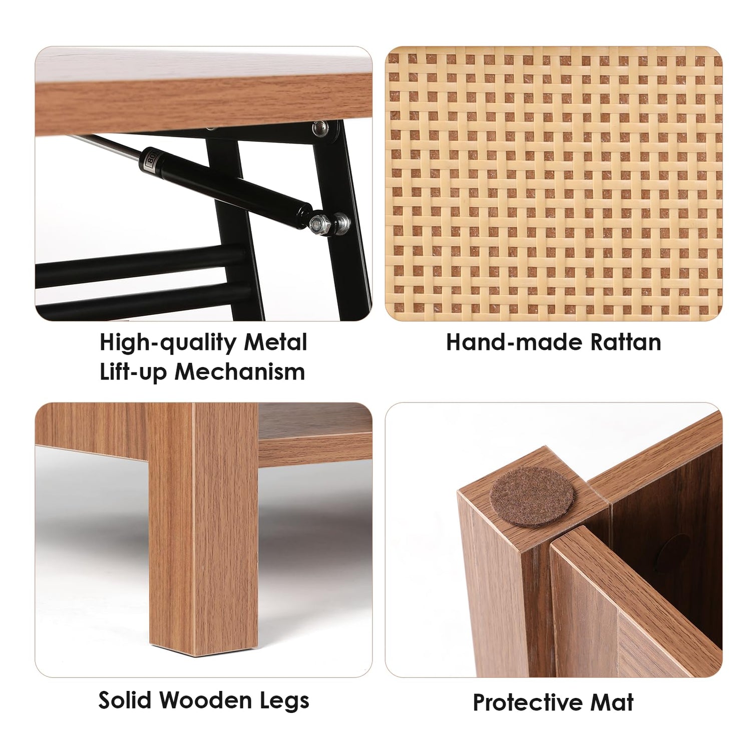 VOWNER Wood Lift Top Coffee Table with Large Hidden Compartment, Rattan Decorated Dining Table for Home Small Space, Bohemian Coffee Table with Storage for Home Living Room, Home Office, Espresso