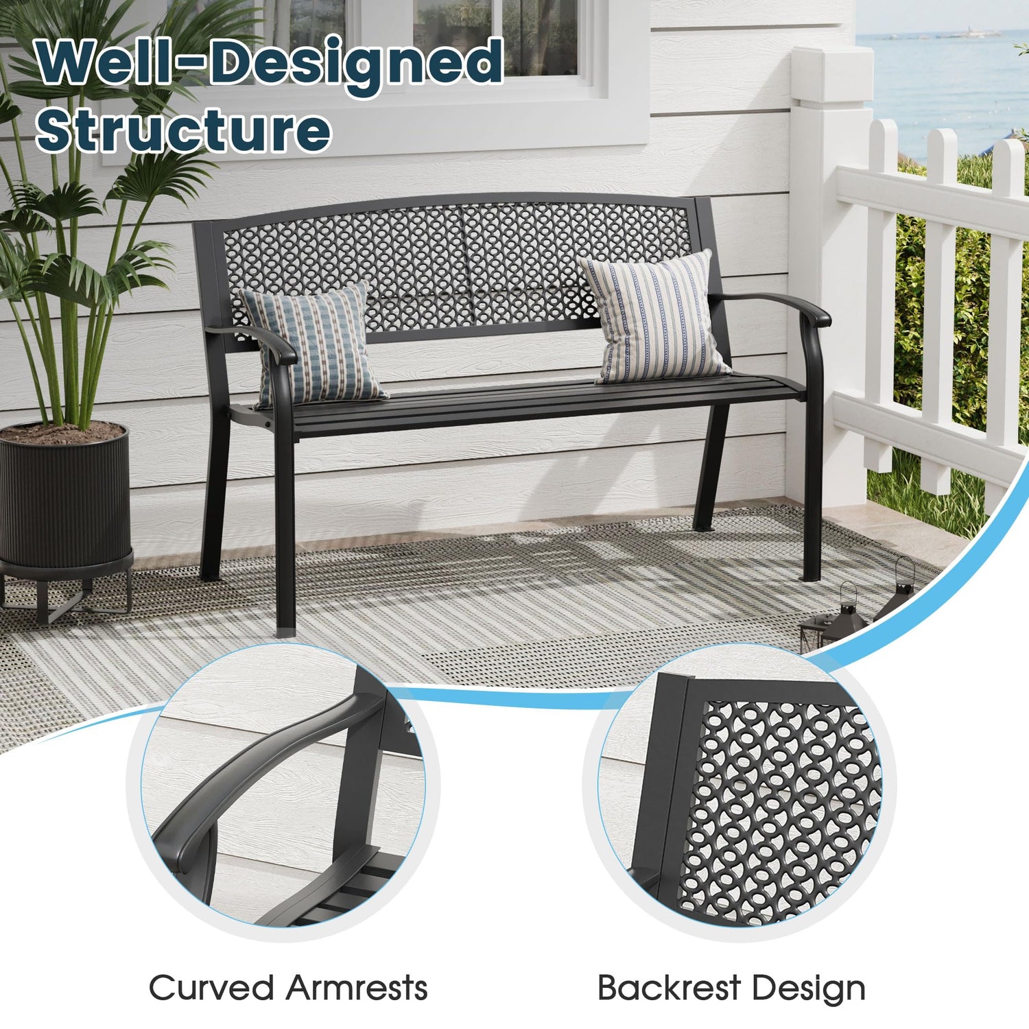 - 【Sturdy Bench】 The solid structure of the metal bench ensures sturdiness and stability, durable and perfect for use for years. The Patio Chair has weather resistance and can withstand various harsh weather conditions, making it the perfect choice for outdoor use