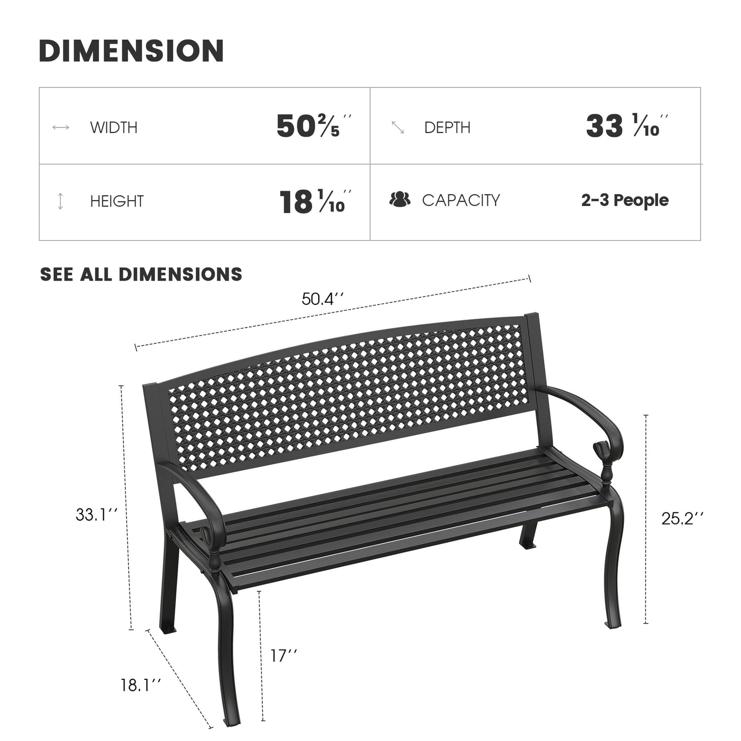- 【Ergonomic & Comfortable Seat】 Dimension: 50"W x 24"D x 33"H. The park bench comfortably seats 2-3 people with its generously wide design. An ergonomic backrest offers proper lumbar support, the outdoor garden bench offers both comfortable seating and elegant charm, making it a perfect addition to gardens, parks, yards, lawns, and more