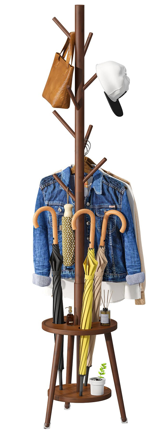 Vriccc Bamboo Wood Coat Rack, Coat Rack with Umbrella Holder, Adjustable Height Wooden Coat Stand with 8 Hooks, kids coat rack, Used In The Bedroom Living Room, Office To Hang Clothes, Hats, Bags
