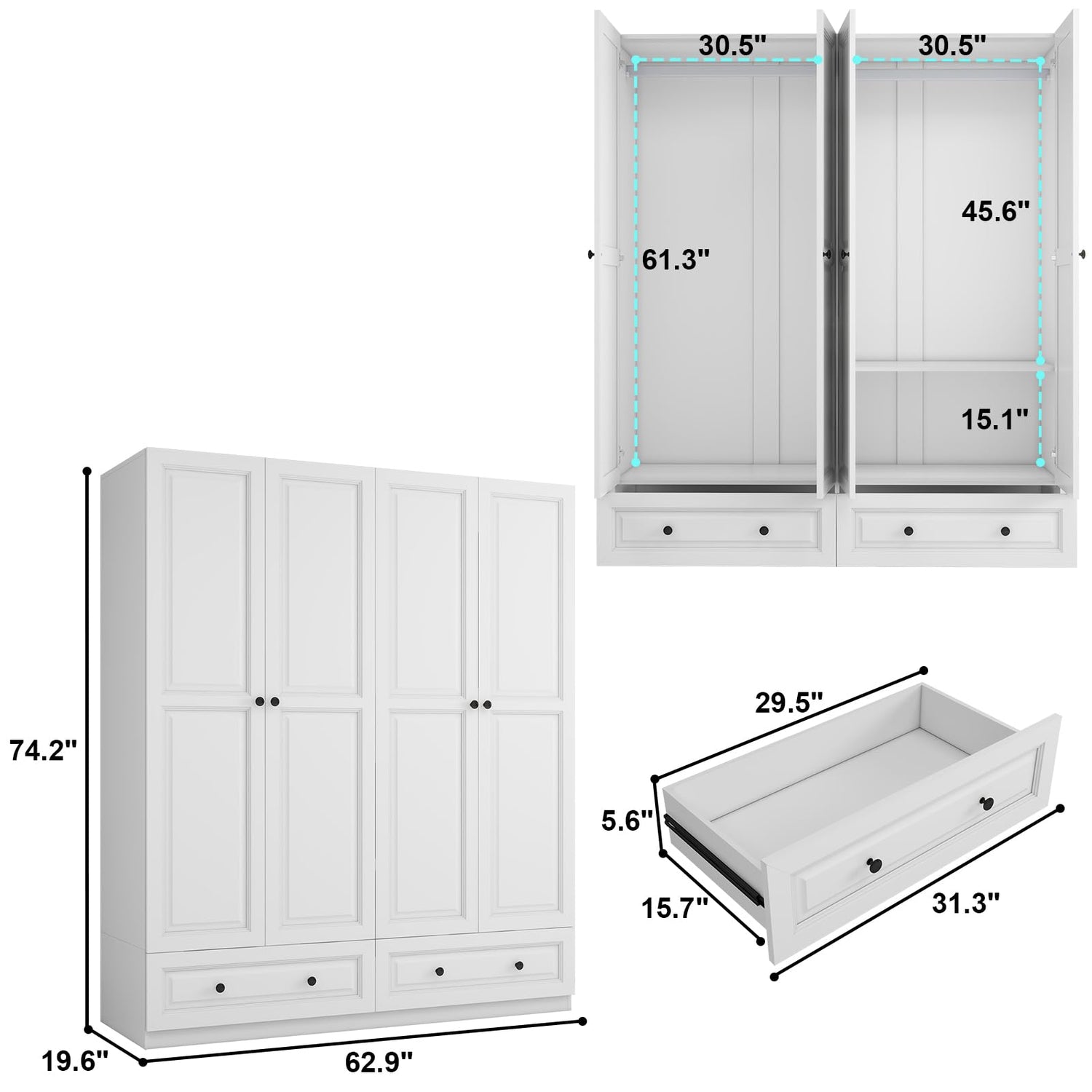 Vrmuxita Armoire Wardrobe Closet with Drawers: 74" White Tall Wooden Wardrobe Closet for Hanging Clothes, Large Bedroom Armoires with 2 Drawers, 4 Door Armoire Storage Cabinet (White, 63")