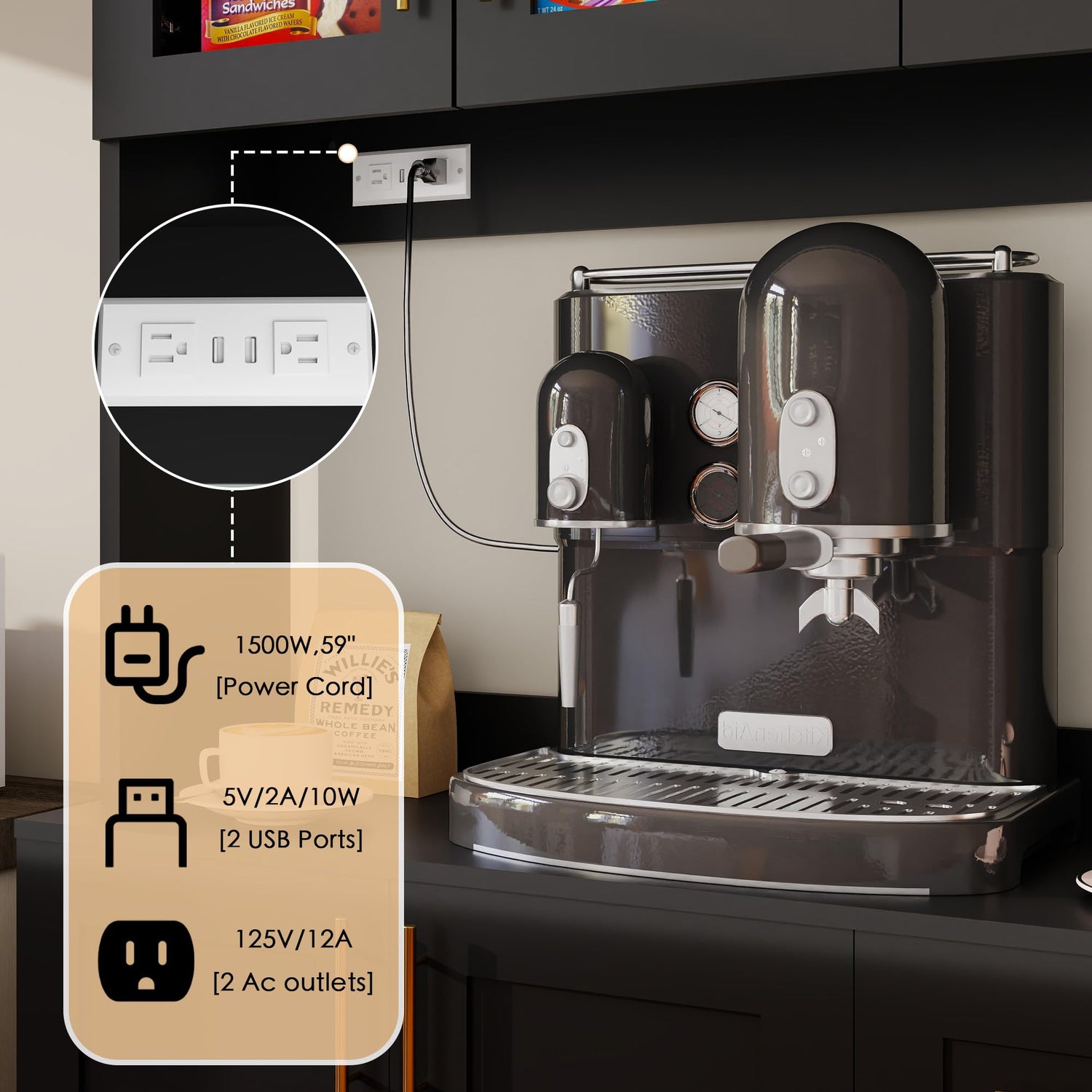 - Multi-Functional Design: Crafted from high-quality engineered wood, the tall kitchen cabinet pantry is built for durability and includes an anti-tip device for added safety. The black pantry cabinet with doors features a built-in adjustable LED light strip with 3 color temperatures—cool black, natural light, and warm yellow—plus 10 brightness levels, all powered via a convenient USB connection. The freestanding pantry cabinets also includes 2 AC outlets and 2 USB ports on the side, allowing you to power multiple kitchen appliances simultaneously.