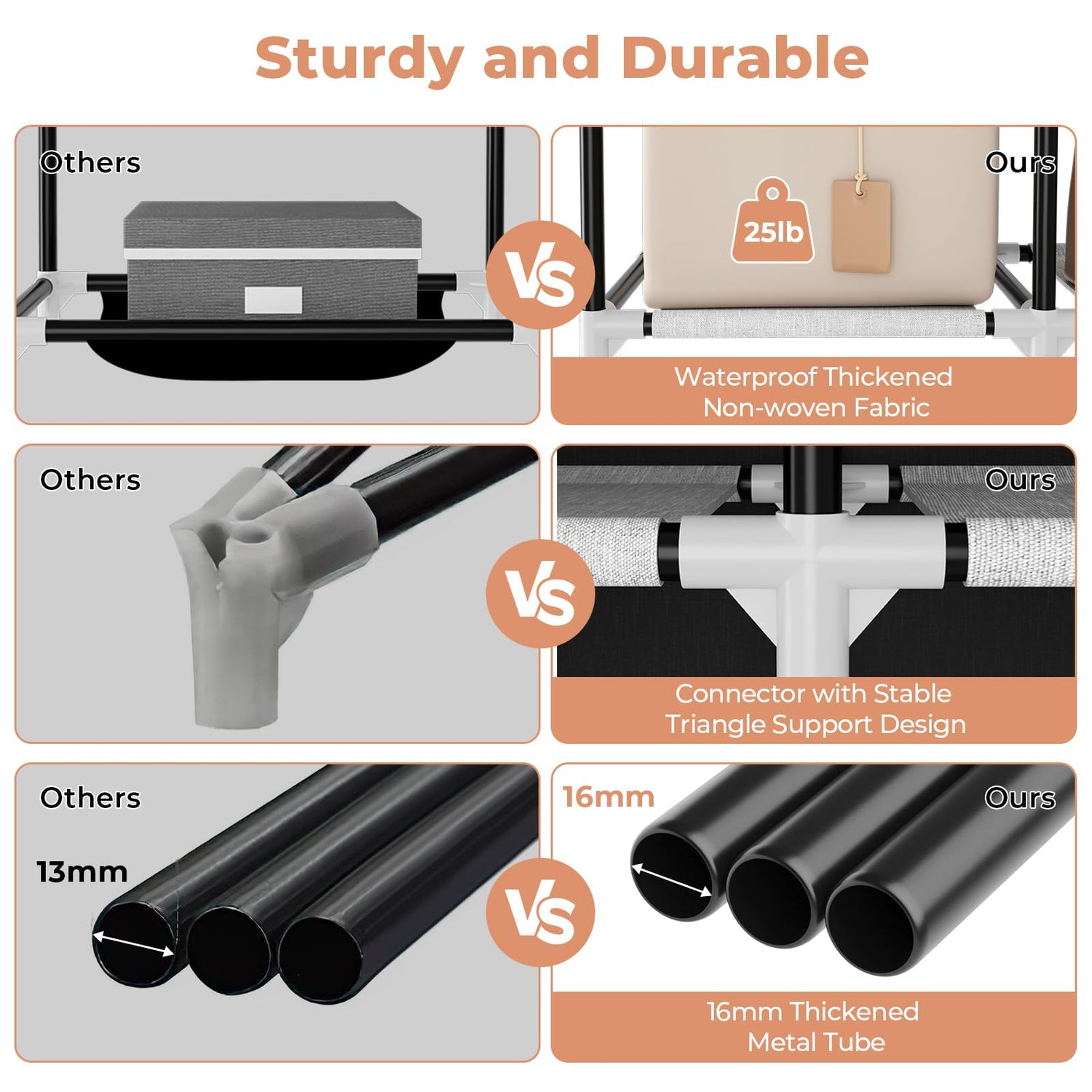 - [Sturdy and Durable Construction] Closet storage organizer is made of thickened metal tube, waterproof non-woven cover and reinforced PP plastic connectors. Provides superb weight capacity, sturdy, and durable. Meet your long-term storage needs.