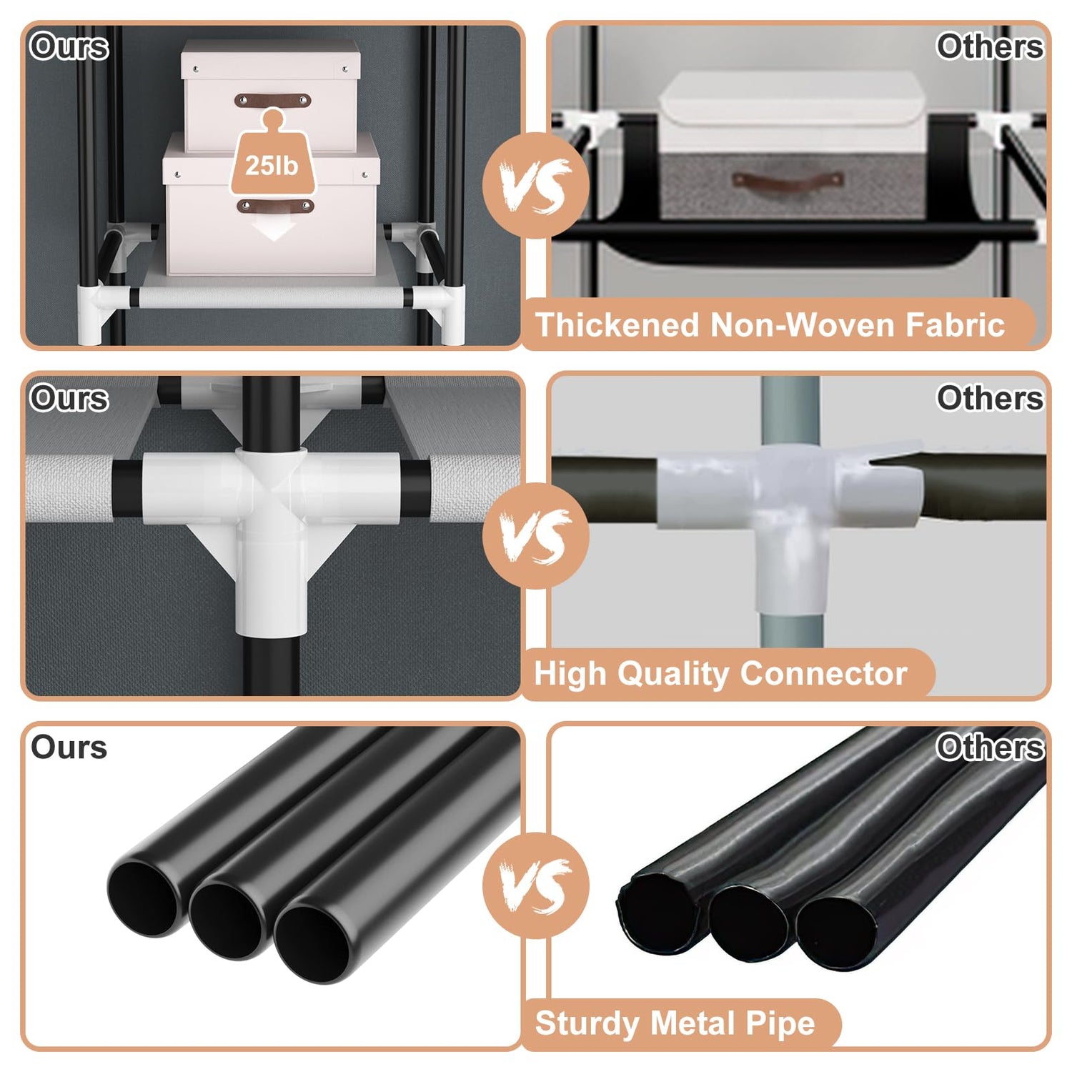 - [Sturdy Portable Wardrobe] This portable covered clothes rack is made of high-quality waterproof non-woven fabric cover, reinforced anti-rust steel pipe and thickened PP plastic connectors, portable wardrobe closet the metal frame is stable, not easy to bend, able to support heavier weight, and can be used for many years, to meet your long-term storage needs.
