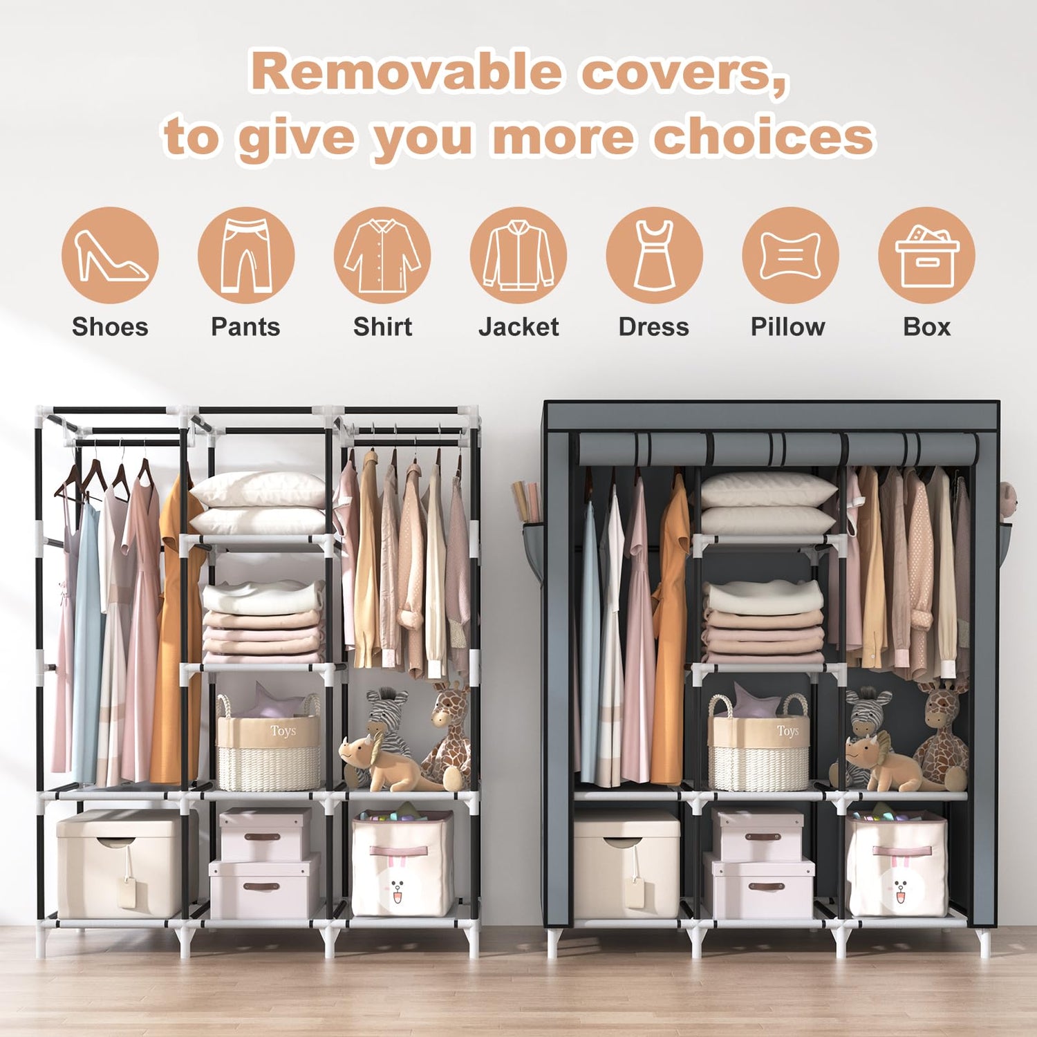 VTRIN Portable Closet Wardrobe for Hanging Clothes with 2 Hanging Rods and 8 Storage Organizer Shelves,Sturdy Large Wardrobe Closet for Bedroom Free Standing Clothes Rack with Cover,Grey