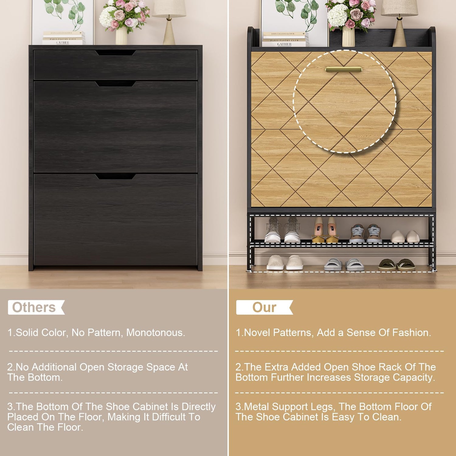 - Sufficient Storage Space: This shoe cabinet with 2 flip drawers and an open shoe shelf at the bottom, can store 20 pair of shoe and boot. Top shelf of the hidden shoe rack can placing bag, plant, decorations, etc. provide you with ample storage space