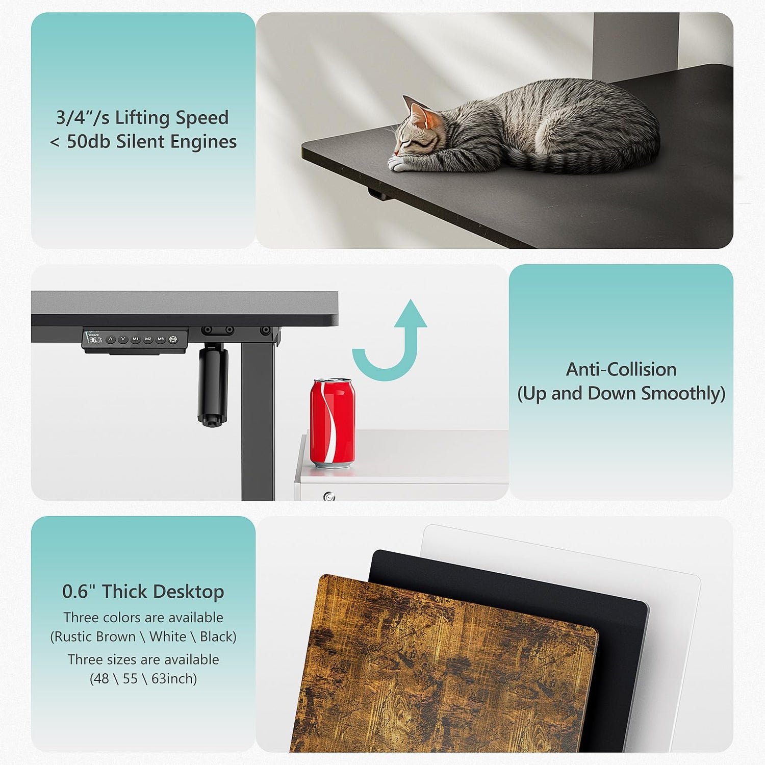 - Multiple Safety Features: This electric standing desk features anti-collision, automatically reversing if it detects an obstacle. It retains its height setting when powered off, and features overheat protection, child lock, and rounded corners for safety.
