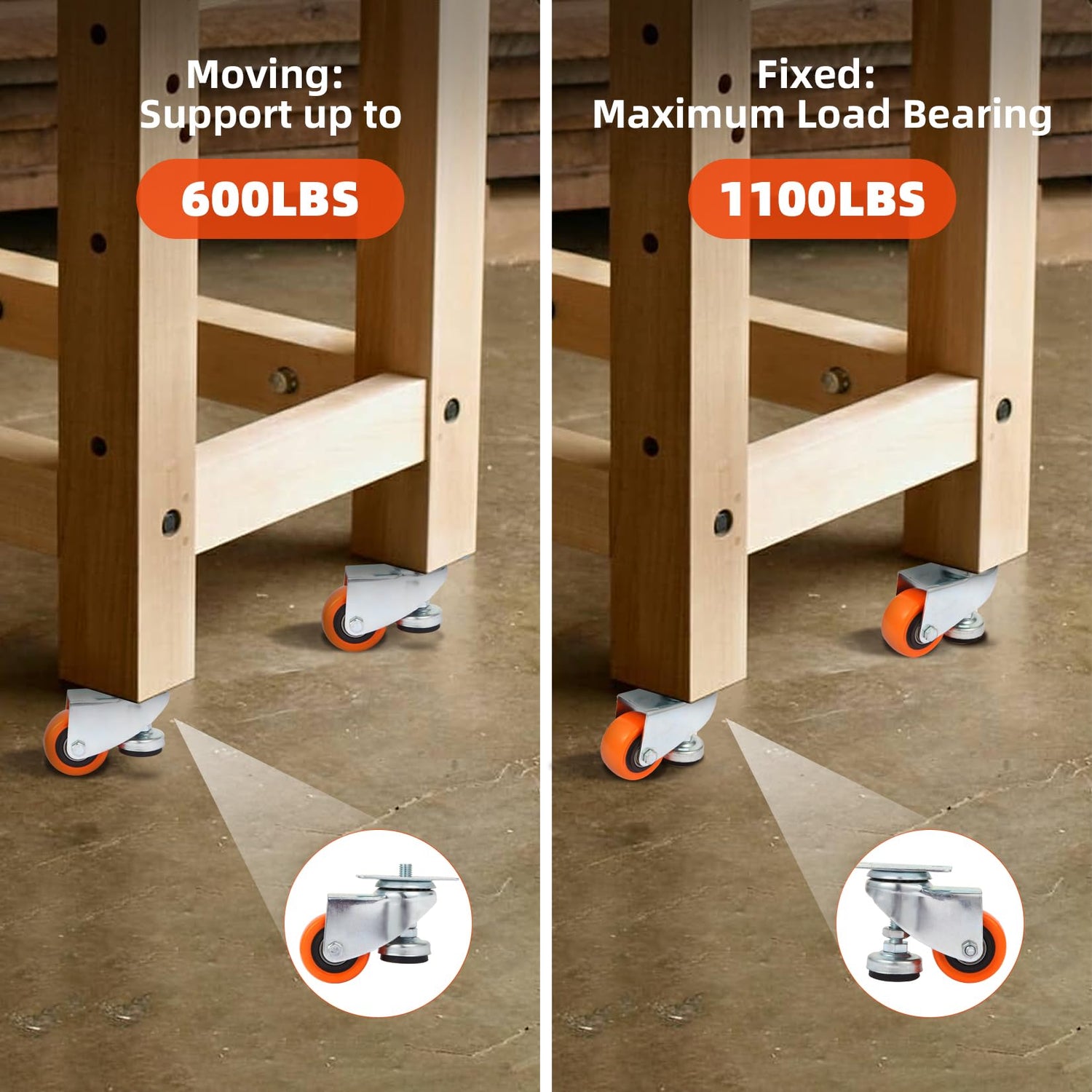 - 👍Heavy Duty Leveling Casters: Heavy duty workbench wheels feature a premium steel and ball bearing construction delivering industrial strength and durability, this leveling machine casters has a bearing capacity of 600 lbs as a set of 4, when the leveling foot down to the same height of the wheel, it can support up to 1100 lbs.