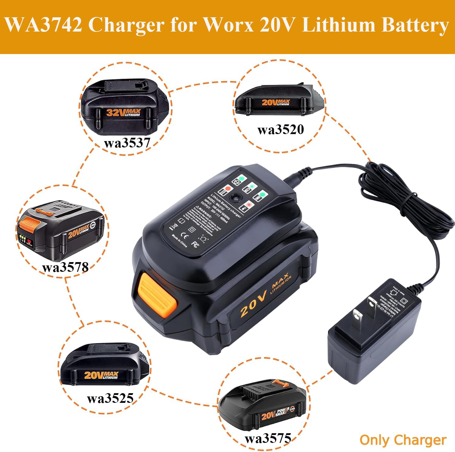 - The WA3742 Charger for worx 20V battery have Fast charging - Universal 100V to 240V voltage input, wide compatibility to support worx 18/20V Lithium Ion batteries, charge batteries in a highly efficient way.