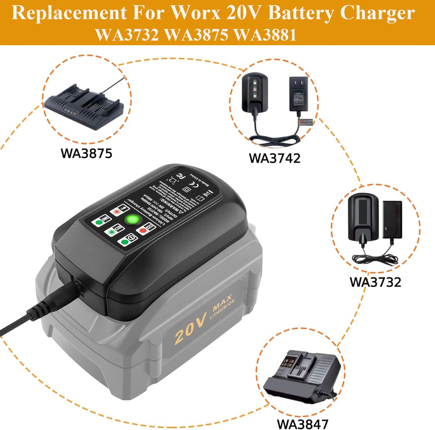 - Replacement For Worx 20V Lithium Battery Charger WA3732 WA3875 WA3881 etc. Small size (5 x 3.6 x 3.3 in) Convenient to carry and can be charged anywhere.