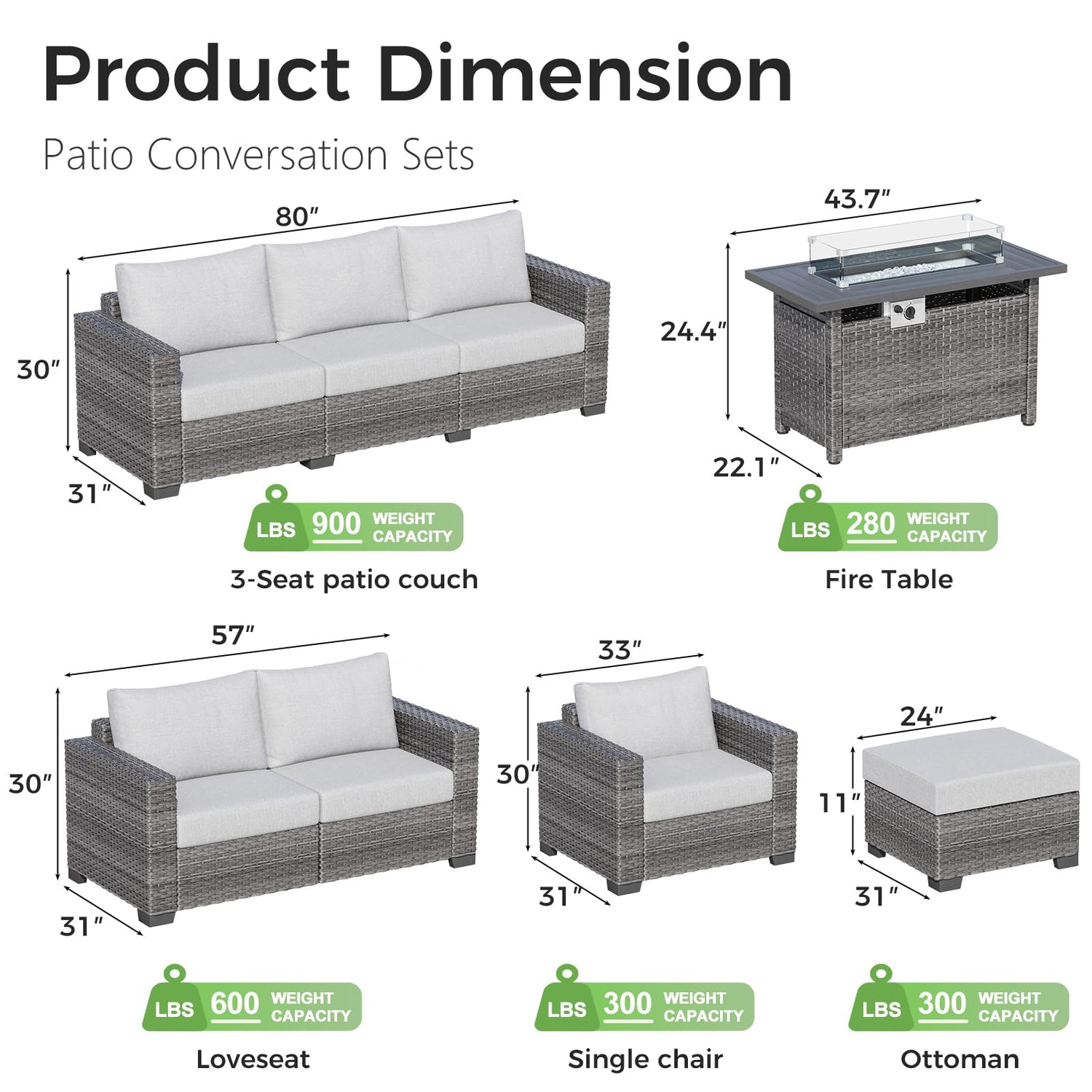 - 【Package List & Support】The patio sectional set ships in 6 boxes (may arrive separately), including 2 single chairs, 2 ottomans, 1 three-seat sofa, and 1 fire pit table. Standard 20lb propane tank required (not included). Our 24-hour response team ensures fast and friendly support