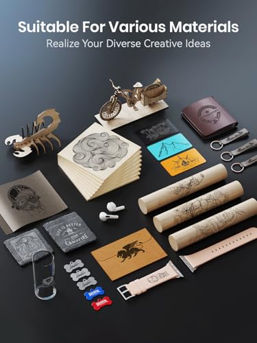 - [Engraving Scope] Can engrave non-transparent materials such as cork, plastic, leather, fabric, cardboard, etc. Acrylic, glass, ceramic and other transparent materials need to use colored paper (not included);❌ Can engrave on coated metal and stainless steel, but not on pure metal, plated metal. Using a spinner (not included), it can engrave larger/round items such as wine glasses, baseballs, etc. It is ideal for DIY, customization and education. You can use it for home decor or personalized gifts (birthday, holiday, anniversary or wedding), pet name tags and personal style accessories. Also, it can be used for food (macaroons, cookies, etc.) to help your small business grow well.