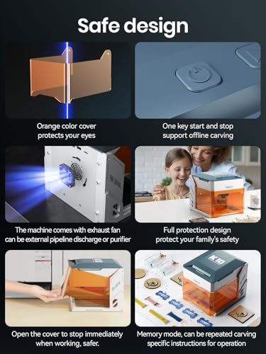 - 【No Installation Required & Safe】: no assembly required, easy and portable to operate, fully wrapped design for more safety. When the protective cover is opened, the laser emission will stop immediately, effectively preventing any potential leakage. If the engraver is tilted at an angle of more than 13°±5° from the horizontal and remains there for more than 1 second, the engraver will stop running immediately. Orange acrylic lid design allows close viewing of the engraving without the need for goggles. Built-in fan that can also be connected to our air purifier (not included).