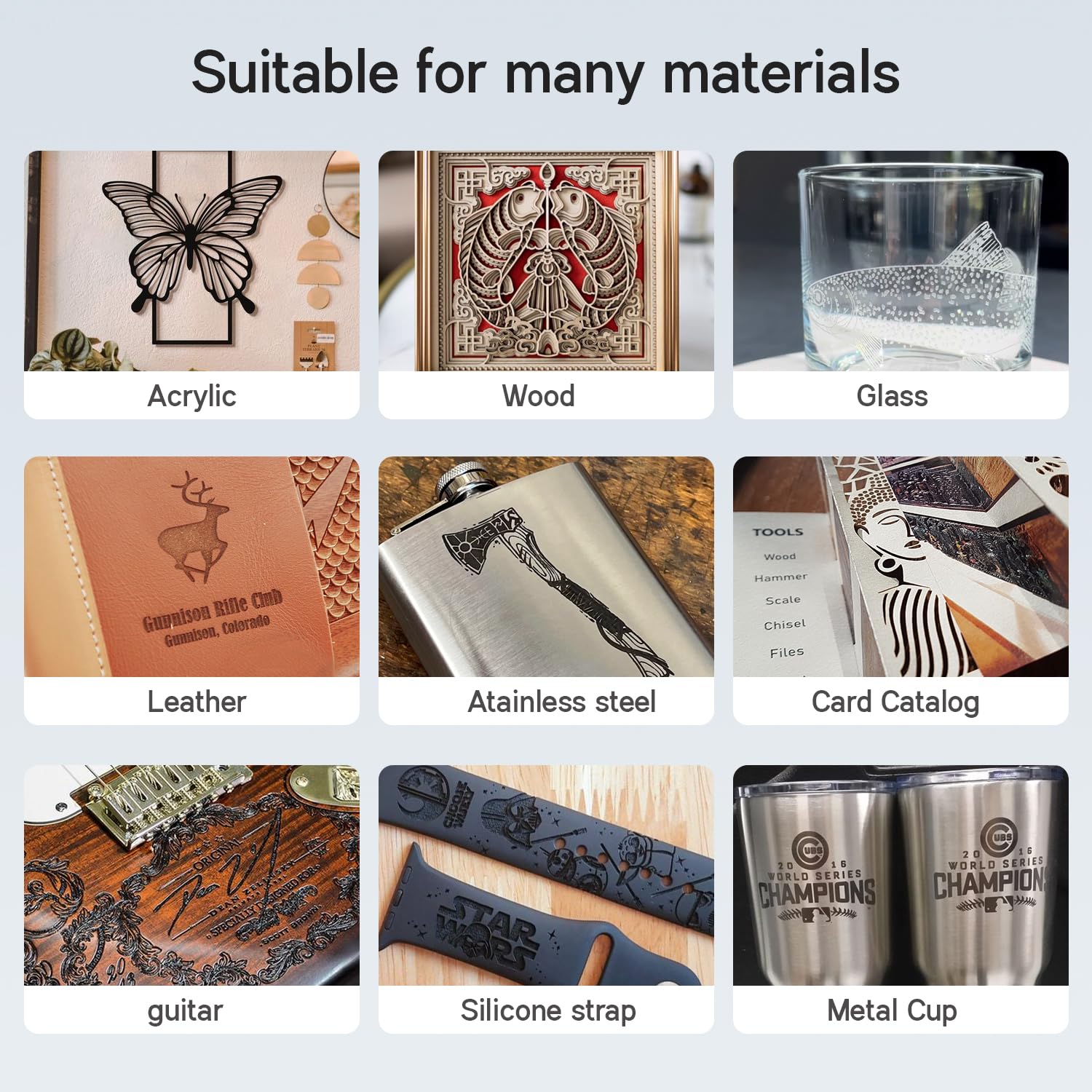 - 【Powerful】WAINLUX X1 5000mw can engrave non-transparent materials such as cork, plastic, leather, fabric, cardboard, etc. Acrylic, glass, ceramic and other transparent materials need to use colored paper (not included);it can be engraved on coated metal and stainless steel, but not on pure metal, plated metal. Using a spinner (not included), it can engrave larger/round items such as wine glasses, baseballs, etc. It is ideal for DIY, customization and education. You can use it for home decor or personalized gifts , pet name tags and personal style accessories. Also, it can be used for food to help your small business grow well.