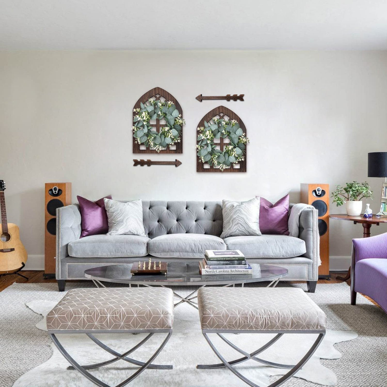 - 1【PACKAGE INCLUDES】2 x Window wood frames,2 x Artificial green leaves wreaths,2 x Arrows,Several screws,a piece of hemp rope, it can be disassembled into 3 pieces