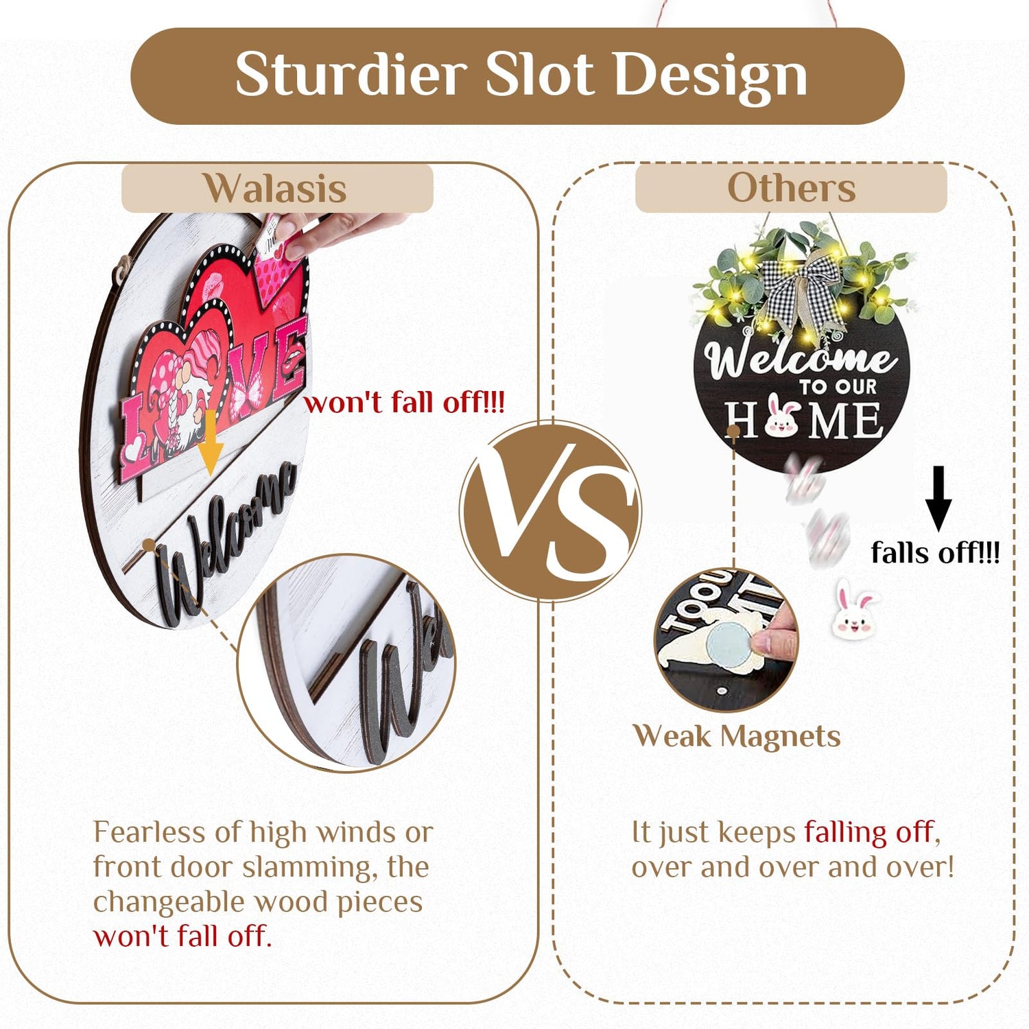 - Durable and Slot Design - Unlike weak magnetic or clip-on signs that often succumb to the whims of weather or accidental bumps, Walasis sign boasts a robust, solid wood construction with an innovative slot-in mechanism. Each of the 13 wooden seasonal piece fits snugly into place, ensuring that changeable sign stands firm against a gusty day or the scorching sun. The signs won't fall down even with the constant opening and closing of your door.