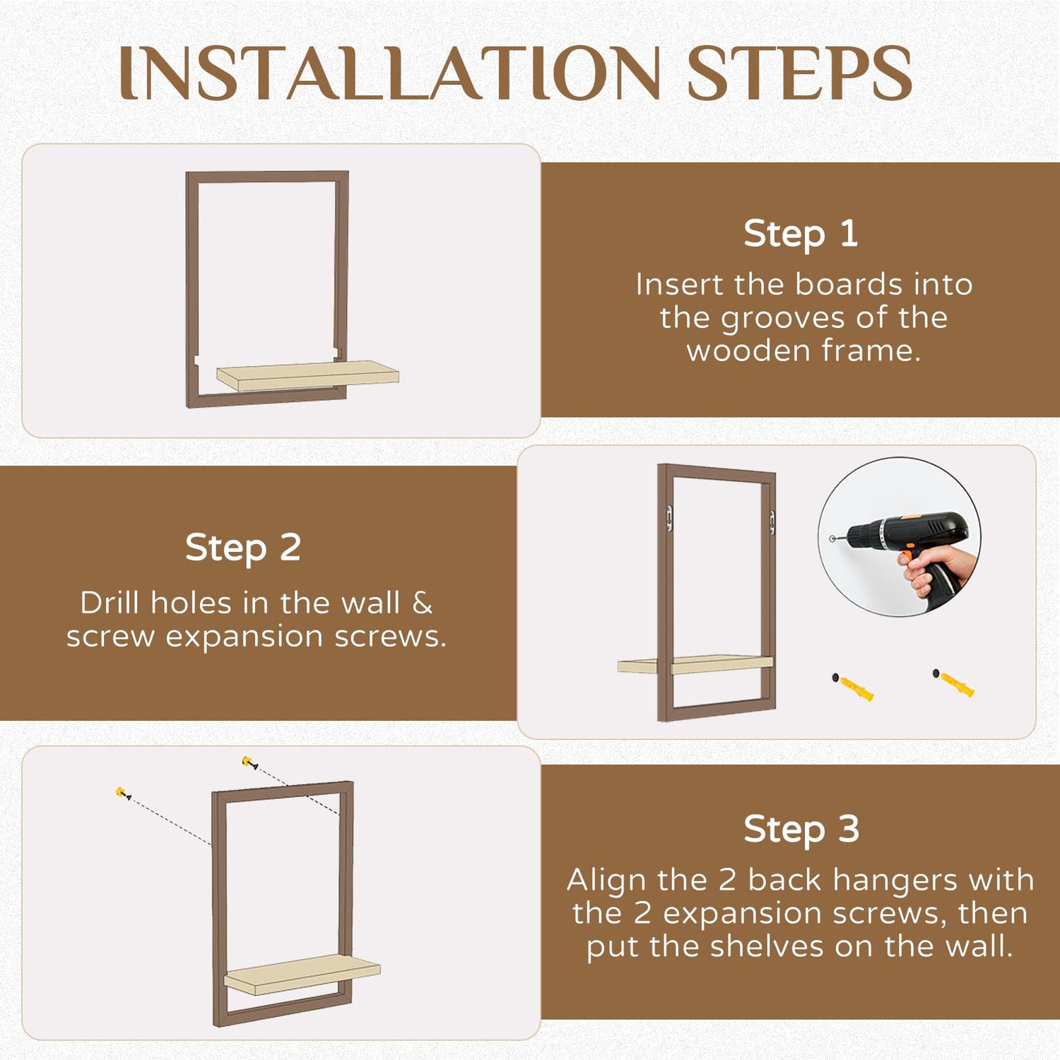 - Easy Shelves for Wall to Install - Simply assemble 4 pieces square modular floating shelf by following the instructions and pulling the plates into the grooves of the wood frames.No extra screws are required except for the nails for hanging. Walasis boho wall shelves make a antique gift for family or friends at housewarming, birthday, anniversary, Thanksgiving or Christmas.