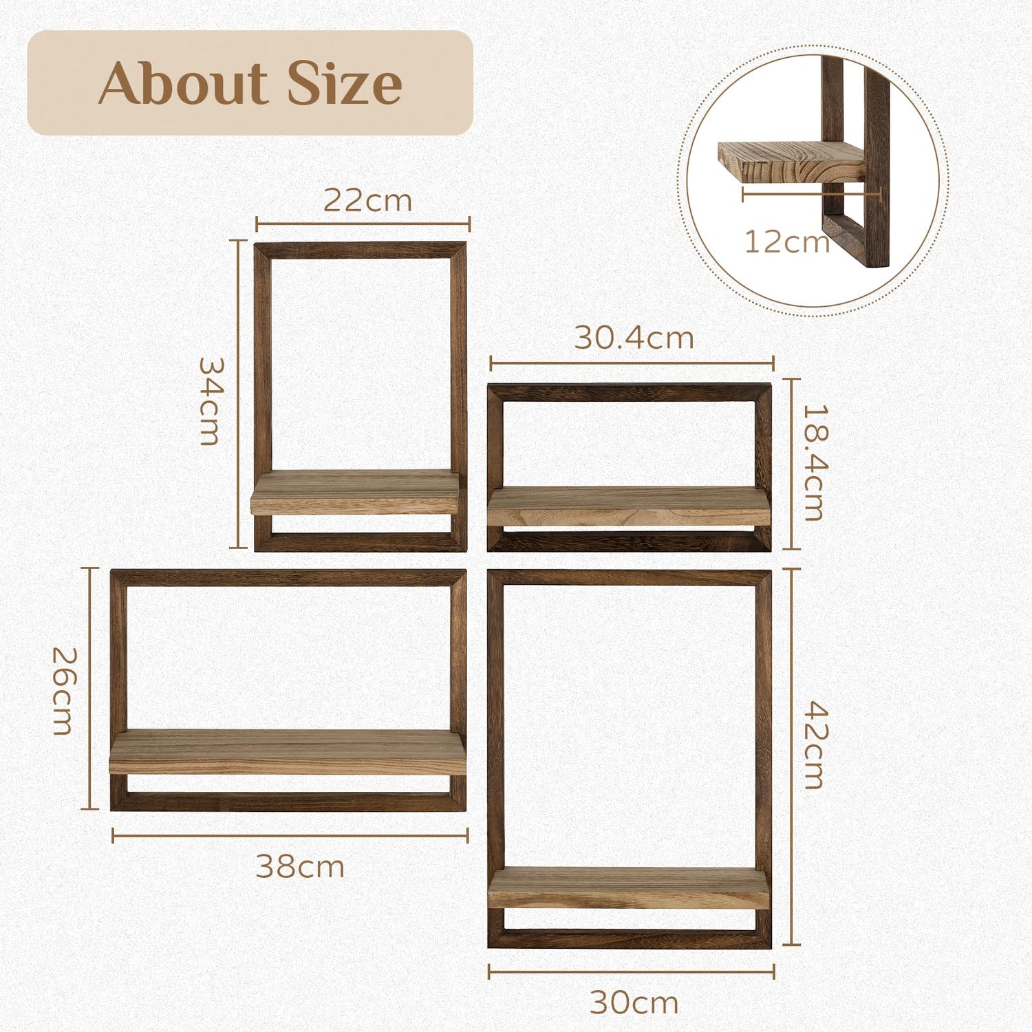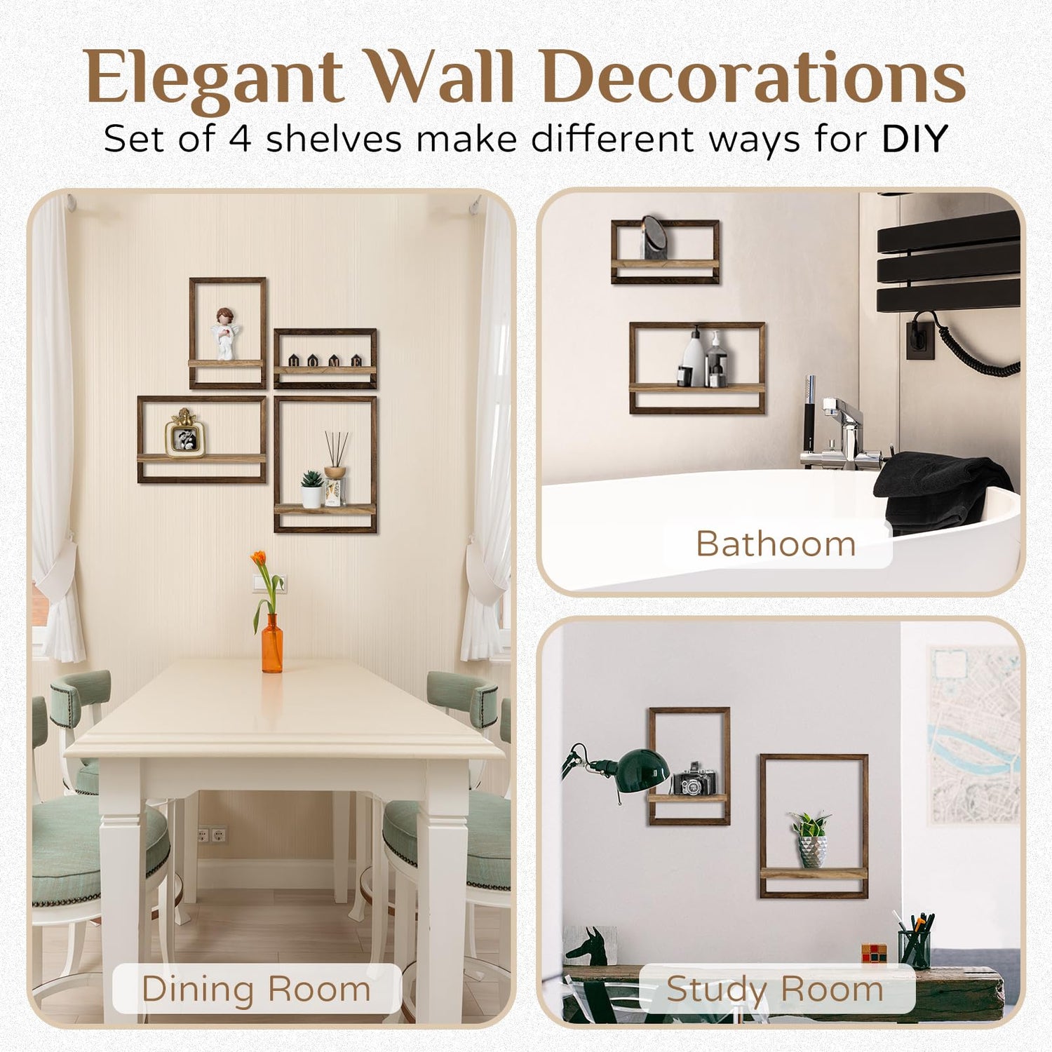 - Functional Organizer for Multiple Scenarios - Four different sized shelving unit give you plenty of space to display picture, curio, shadow boxes, potted plants, vases, figurine or store trophy, cd, book, towel and more. Don't worry, these wood floating shelves bathroom are suitable for all room styles and can be used in the bedroom, bathroom, dining room, fireplace, entryway and office.
