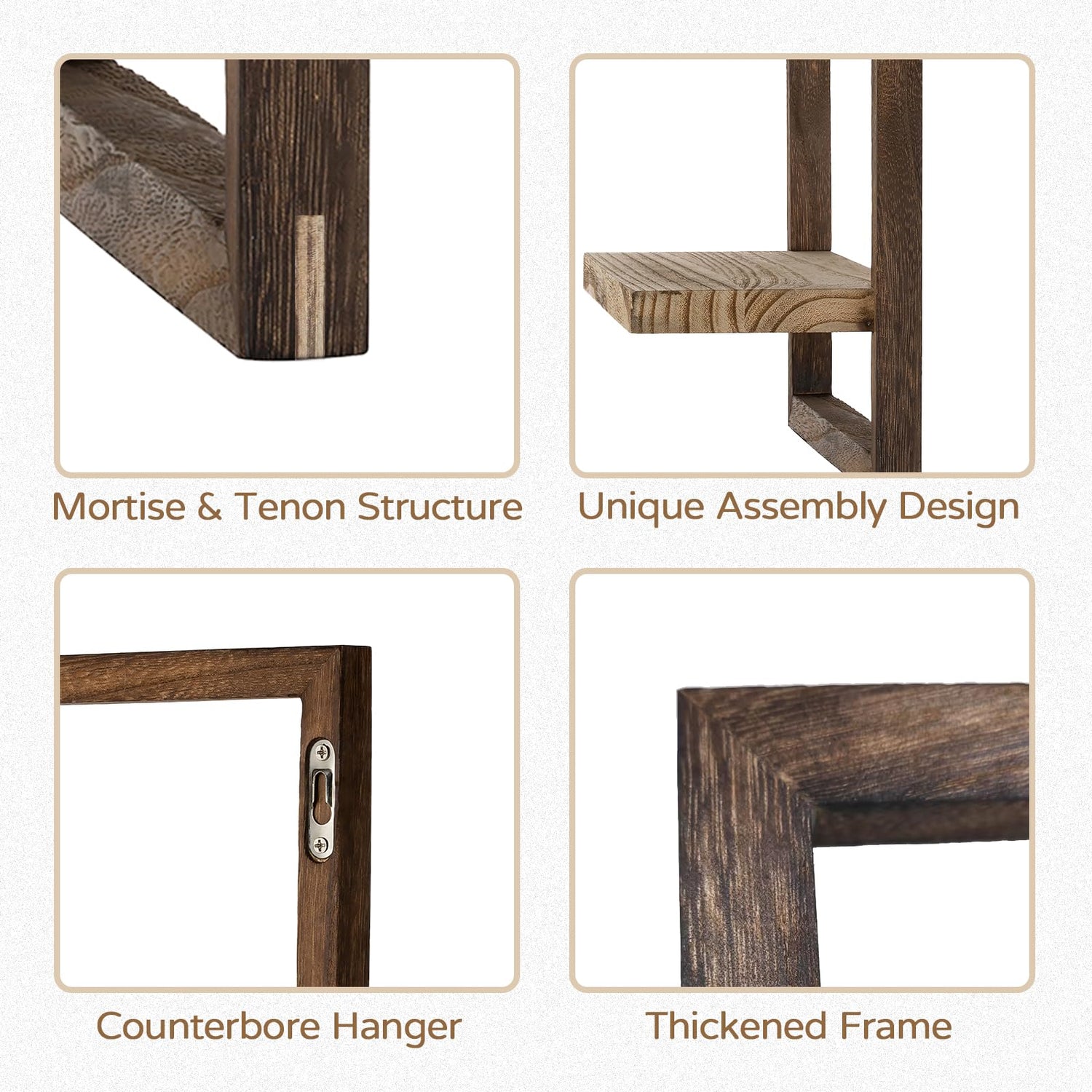- Traditional Craftsmanship & Sturdy Wood - Inheriting traditional Chinese artisan techniques, our big floating shelves sets use sophisticated mortise and tenon structure to skillfully interlock the wooden frames. The modern floating shelves for wall is made entirely of lightweight paulownia solid wood, unique fire-treated to restore the natural texture of the wood as much as possible.
