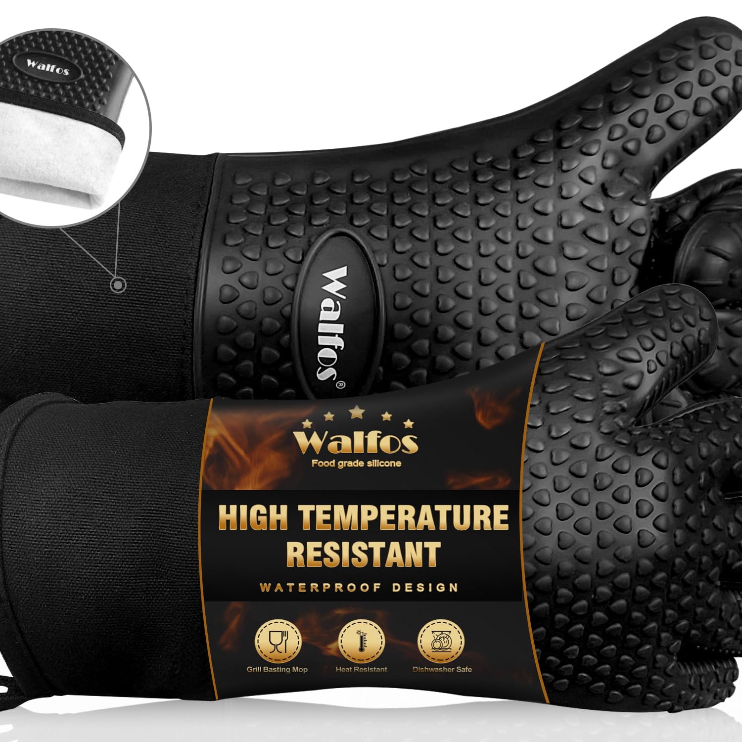 Walfos Silicone BBQ Gloves - Heat Resistant Grilling Gloves, Premium Non-Slip Kitchen Silicone Oven Mitt With Protective Cotton Layer Inside, Waterproof, Great for Grilling, Kitchen and Cooking, Black