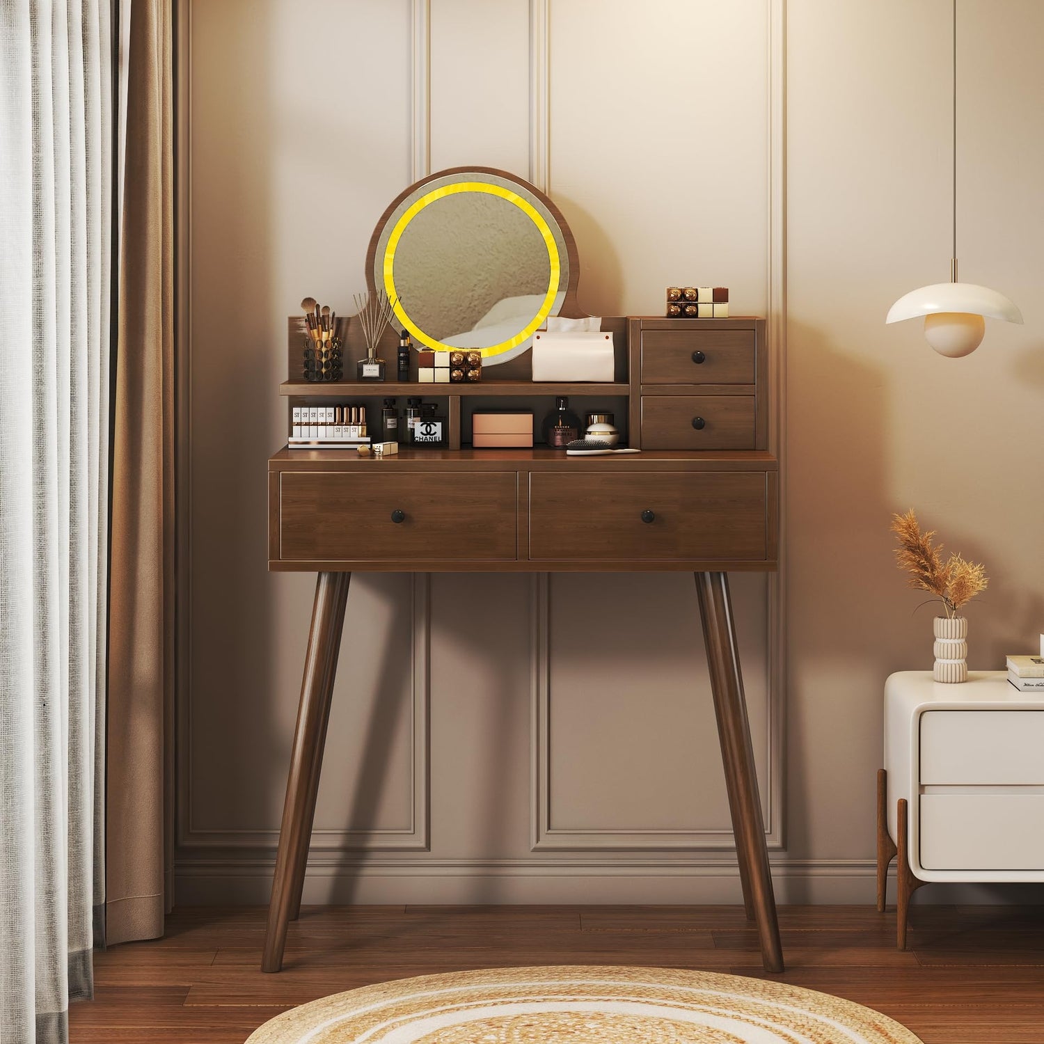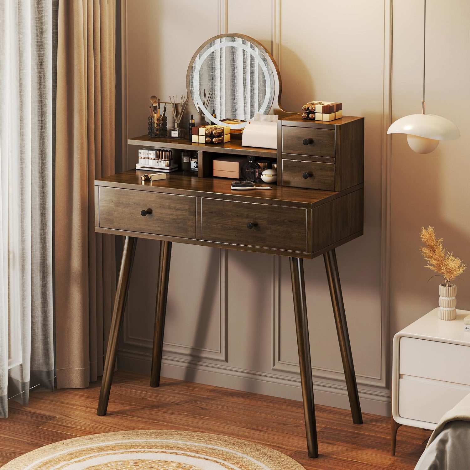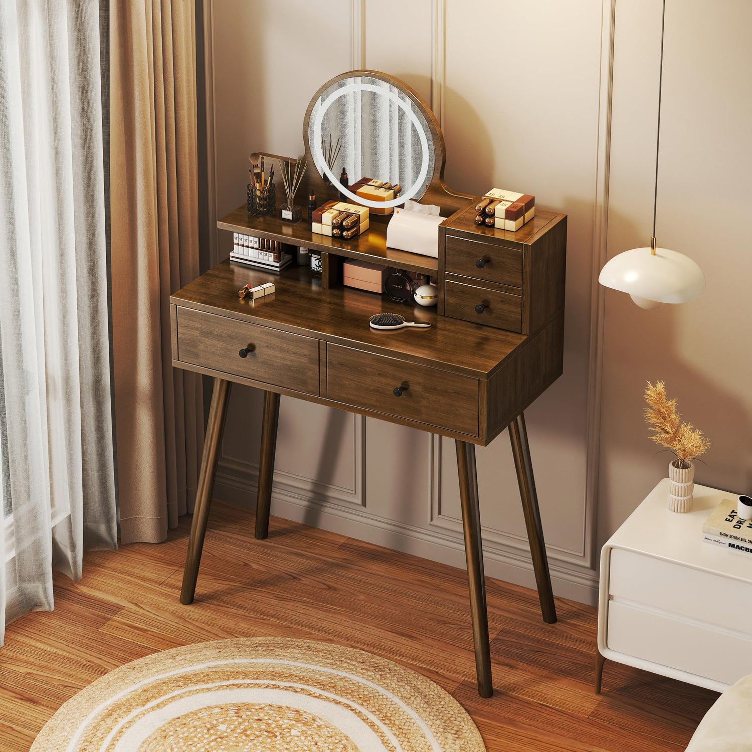 walkclpck Vanity Desk with Mirror and Lights, Makeup Vanity with 4 Drawers Small Vanity with 3 Storage Shelves, Wood Vanity for Bedroom Dressing Room Makeup Studio, Brown