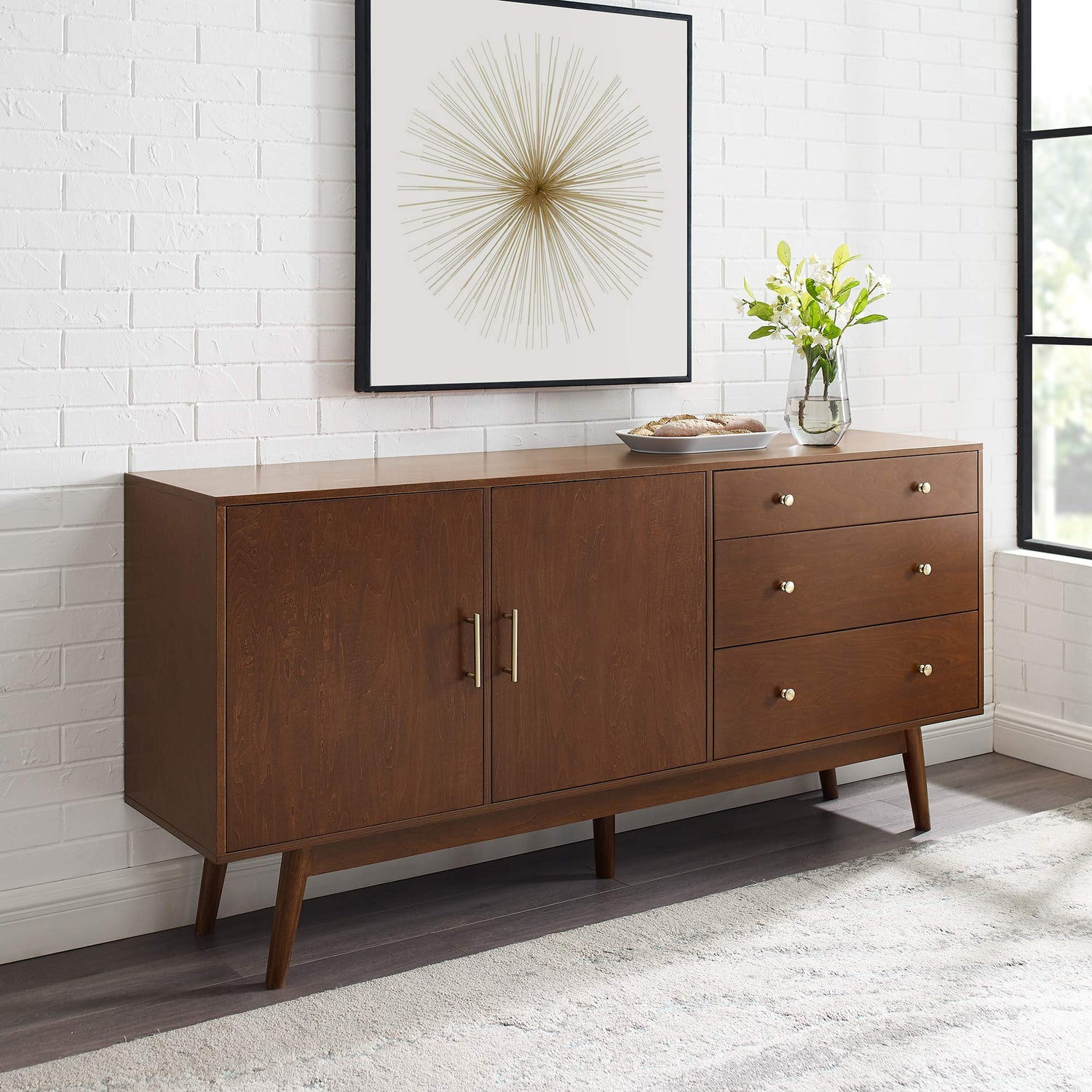 Details: Need extra kitchen space? Running out of room for office storage? We’ve all been there. Why not take home a versatile, 70” modern three-drawer sideboard to do the trick? Stage this stunning wood veneer unit as a kitchen buffet, office credenza, or living room sideboard. Its modern silhouette lets it fit any trending style of your choosing. Two adjustable shelves are available for you to organize however you like. Three drawers run on telescoping metal glides for smooth movement and tapered legs give it such an oh-so boho-chic silhouette. Place it in your dining room, living room, bedroom, or anywhere you need closed storage capabilities. Your home will be cleaner and more stylish in no time!
