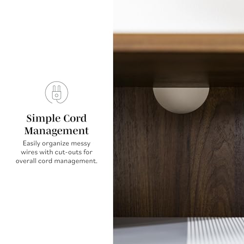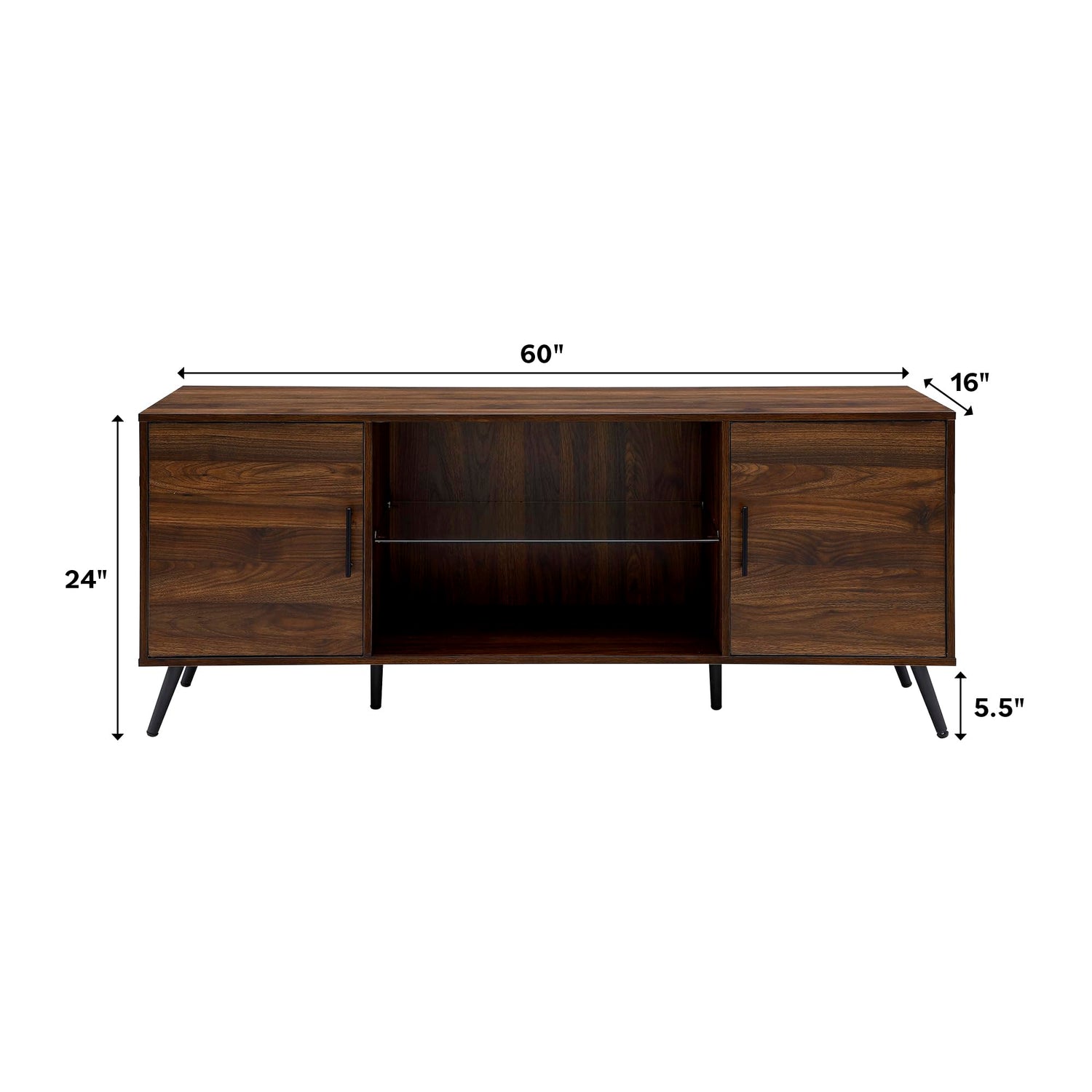 Details: Improve your living room with our TV stand. Featuring a middle glass shelf and closed storage on both sides for you to have a place for your media essentials or décor, whether in your living room or bedroom. The sleek metal hardware, angled legs, and boxy frame create an overall midcentury modern aesthetic. With a cord management feature in the back to keep wires tidy, adjustable shelves, and adjustable rubber feet to prevent it from sliding, this storage console will make a practical addition to your home.