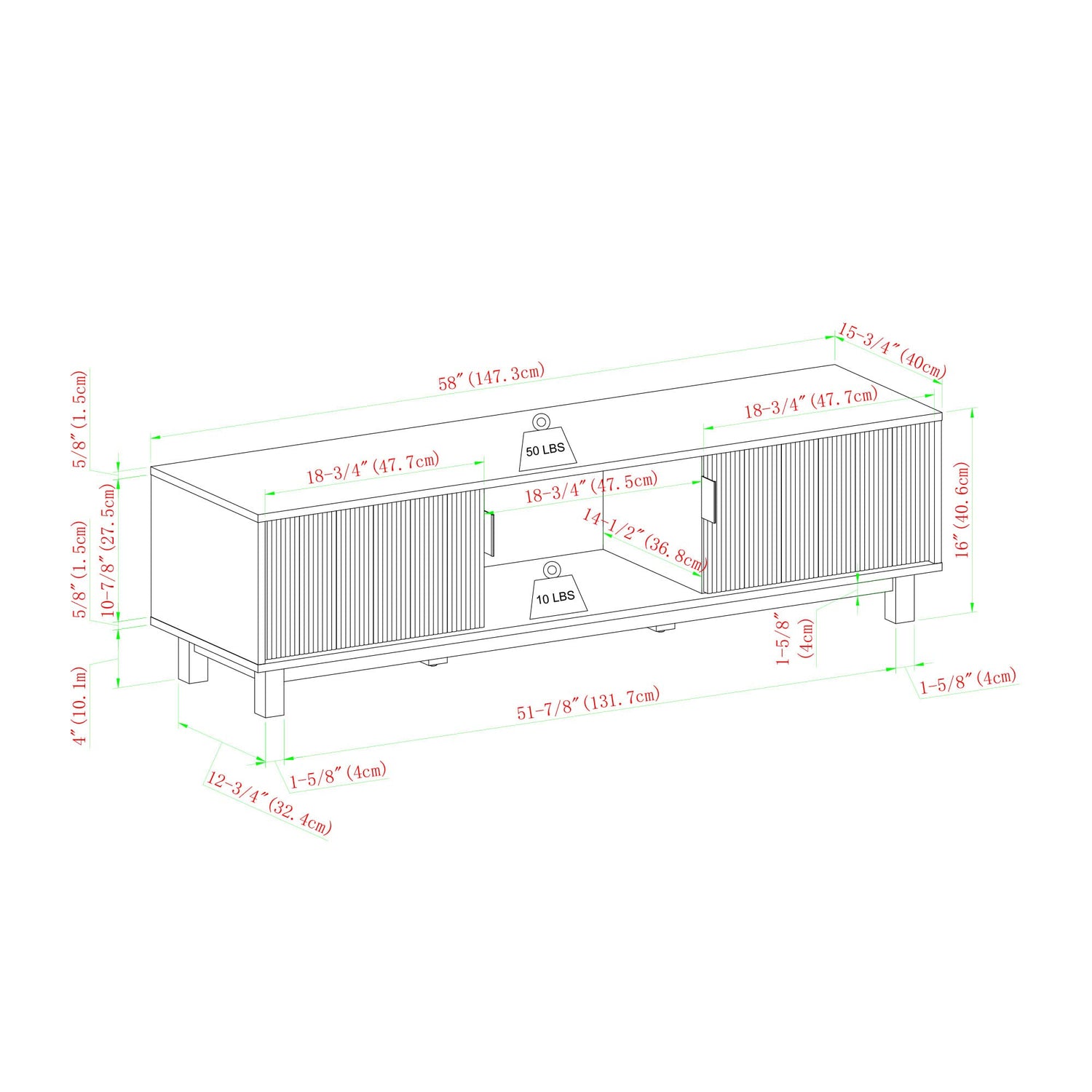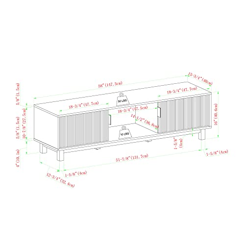 - Dimensions (after assembly) 16" H x 58" L x 15.75" W; 57 LBS