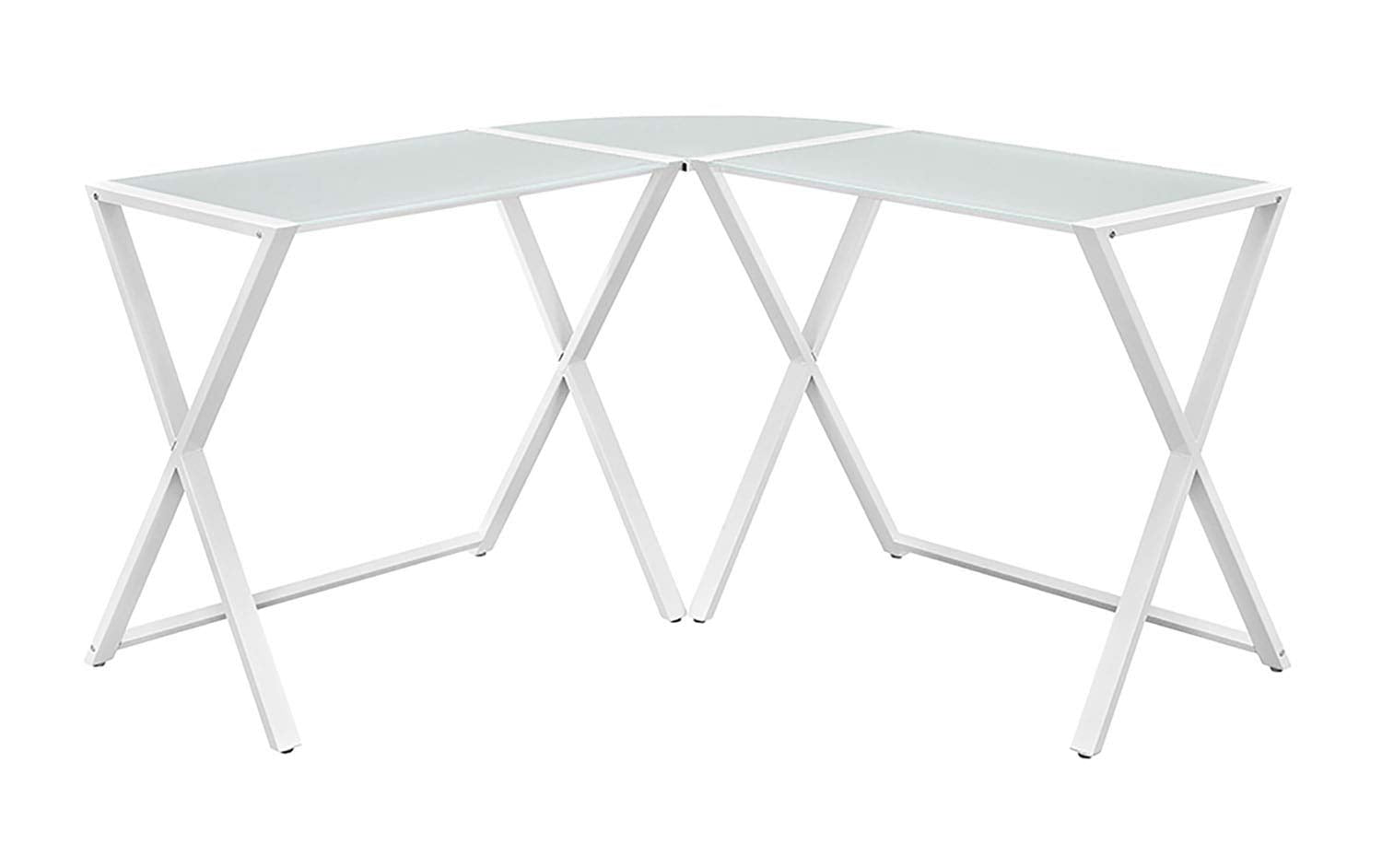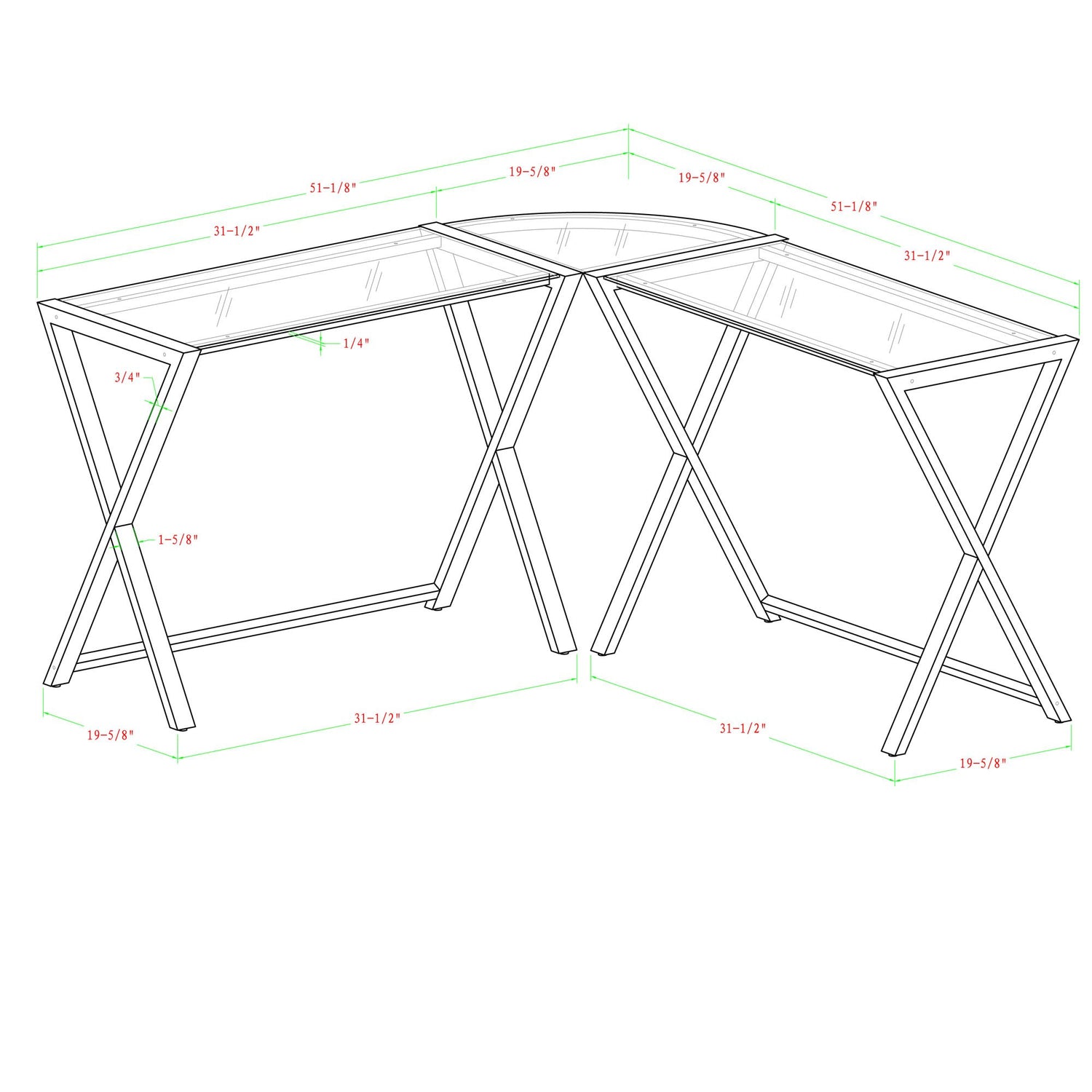 Details: With x-frame designed legs, this versatile l-shaped desk gives a modern feel to your home. Having an angled design made of sturdy, steel metal with a powder coated finish with a tempered glass top, this contemporary desk can fit in just about any corner space, from your home office to your living room. Decorate with vases and framed family pictures, while using it to write on or to work on your computer.