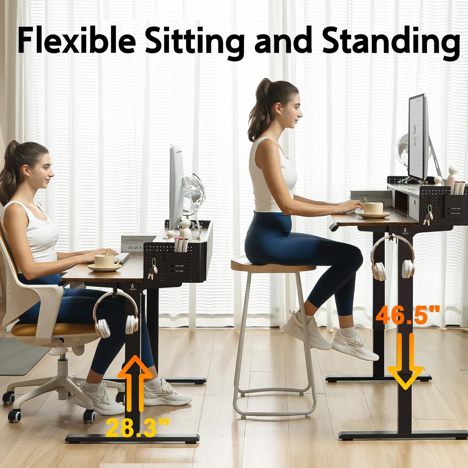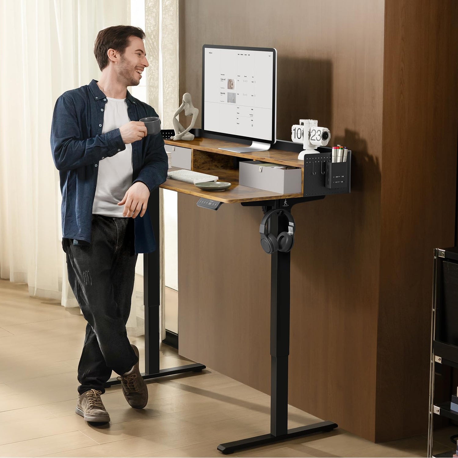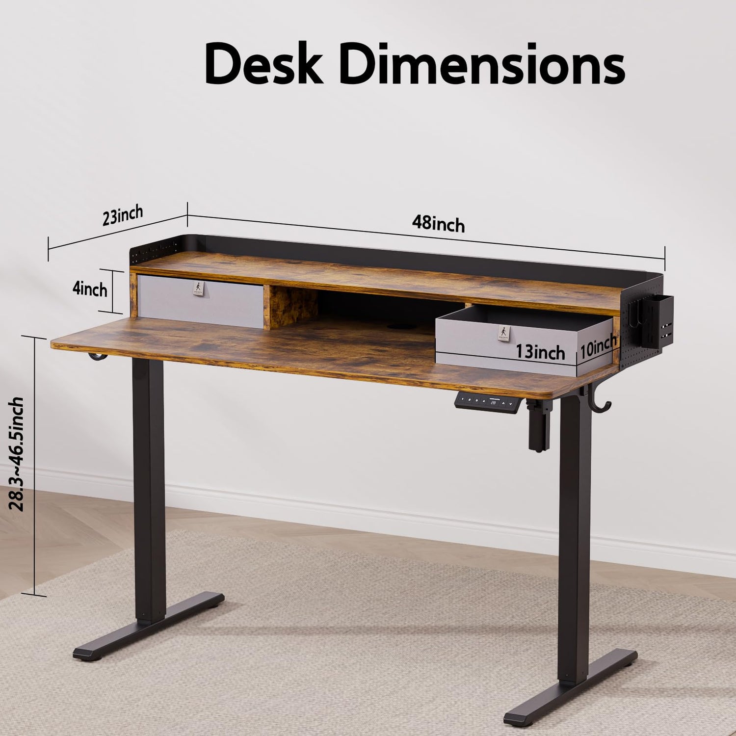 WALKINGDESK 48x24 Inches Electric Standing Desk with 2 Drawers, Height Adjustable Stand up Desk for Home Office, Ergonomic Sit to Stand Desk with Storage Shelf, DIY Board, Hooks, Rustic Brown