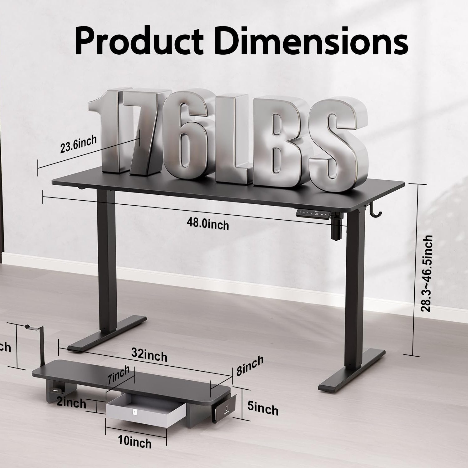 WALKINGDESK 48x24 Inches Electric Standing Desk with Drawer and Monitor Stand, Height Adjustable Stand up Desk for Home Office, Ergonomic Sit to Stand Desk with Phone Holder, 3 Hooks, Black