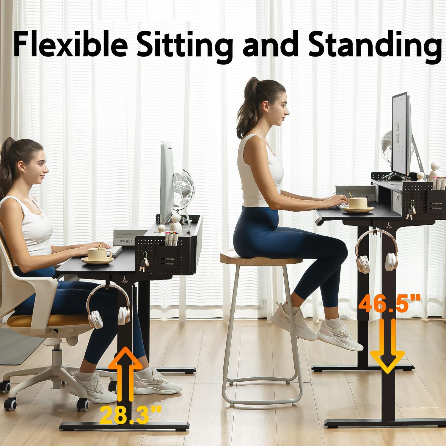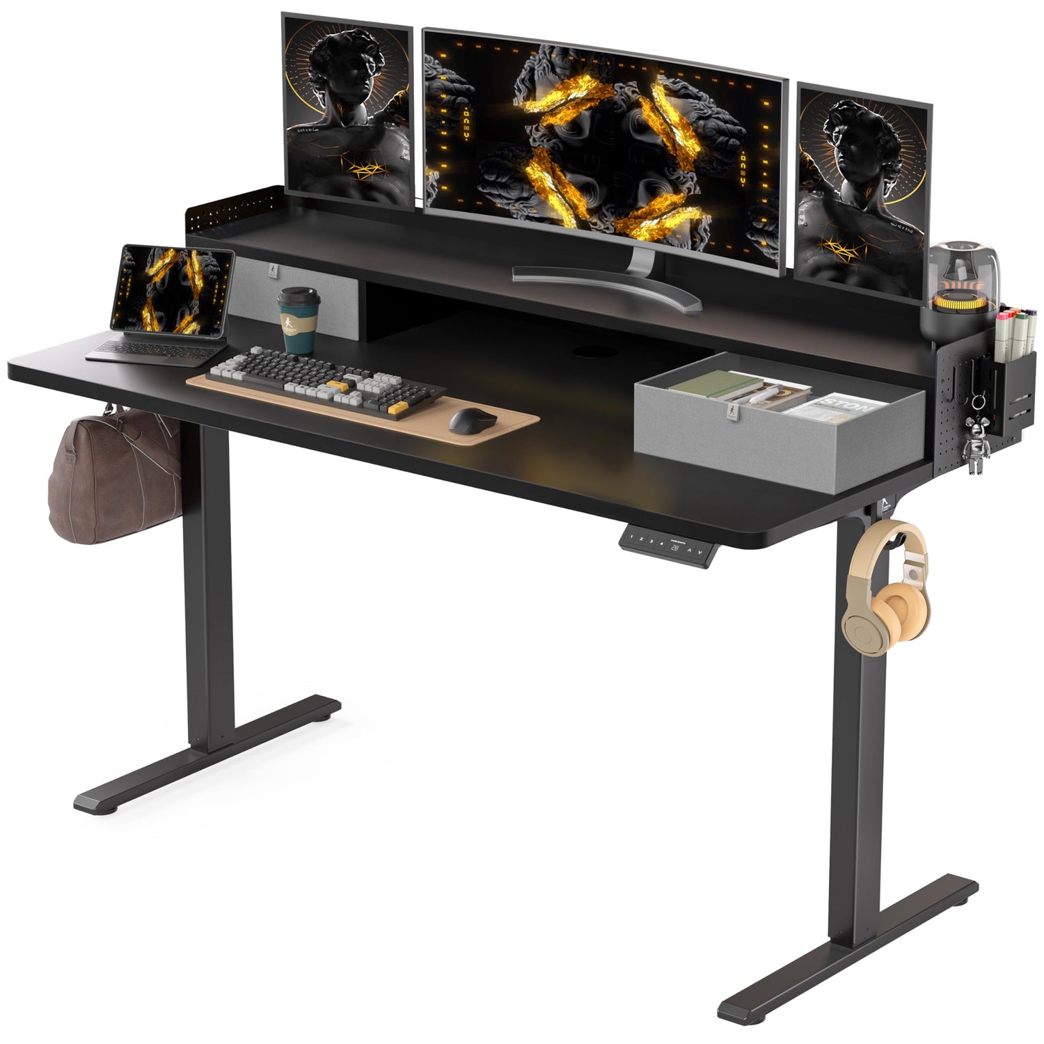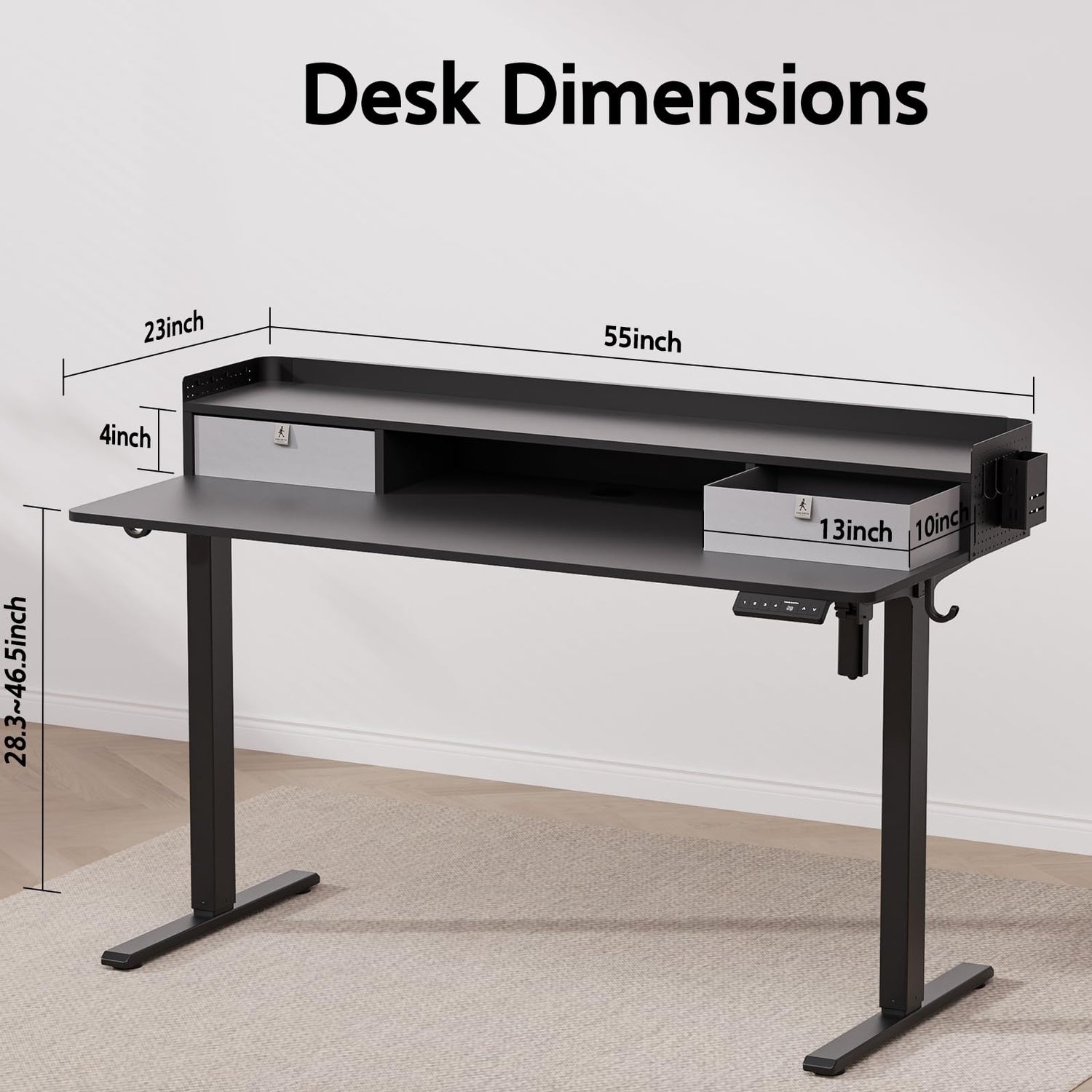 WALKINGDESK 55x24 Inches Electric Standing Desk with 2 Drawers, Height Adjustable Stand up Desk for Home Office, Ergonomic Sit to Stand Desk with Storage Shelf, DIY Board, Hooks, Black