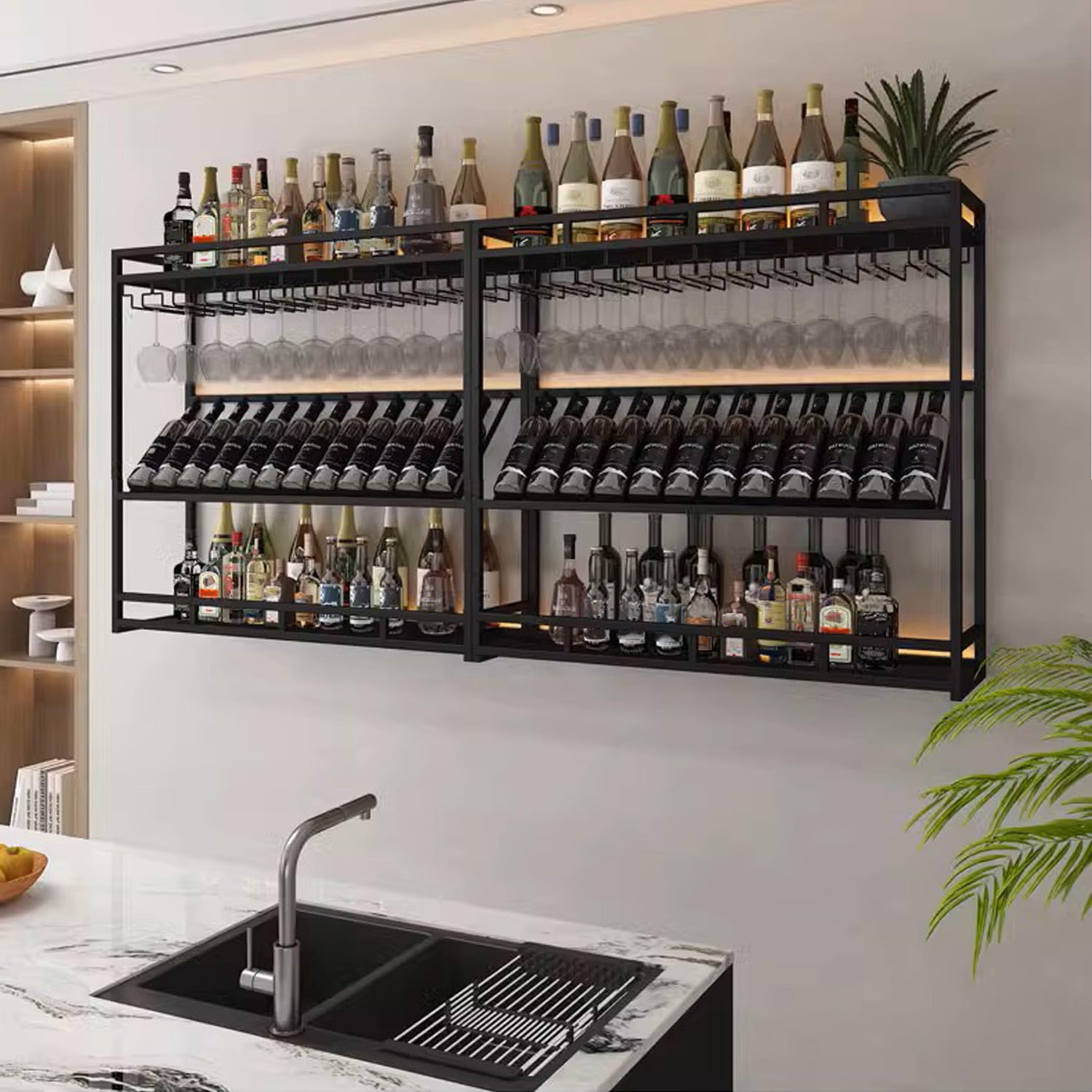 Wall Mounted Wine Rack with LED Lighting Glass Holder, Liquor Bottles Shelves Display Storage Organizer Hanging Long Stemware Goblet Metal for Home Mini Bar Cellar Black
