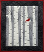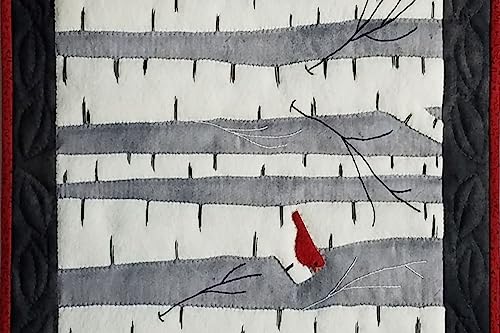 Details: Birches Wall Quilt Kit from Rachel's of Greenfield - SKU: K-0519. The Birches Wall Quilt Kit by Rachels of Greenfield features lovely white birch trees standing starkly against the steel-gray sky of winter. A bright red cardinal nestles in one of the crooks of the trees and adds a pop of color to the wall quilt kit. Quilted leaves border the design. The finished size of this wall quilt is 13"x15" inches and the colors are gray, black, white, and red. The Birches Wall Quilt Kit is a great choice for both beginner and advanced quilters. The kit includes all the necessary pieces, including the wool felt, all fabrics for background borders, back and binding, embroidery floss, patterns, and illustrated instructions. FREE DOMESTIC SHIPPING