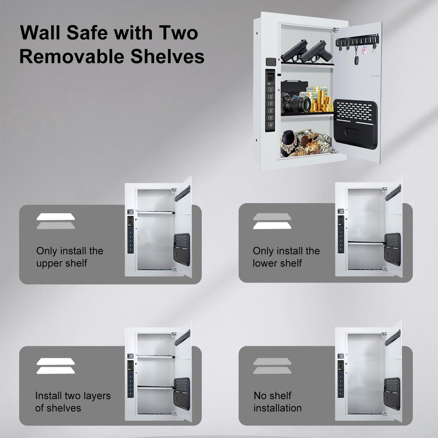 - 【Intelligent Custom-designed interior compartment】 The wall-mounted safe includes a document organizer for your passport,id card and documents, 2 Removable shelves for cutomizing your space to protect handgun,money and jewelry,and hooks for keys and small items.