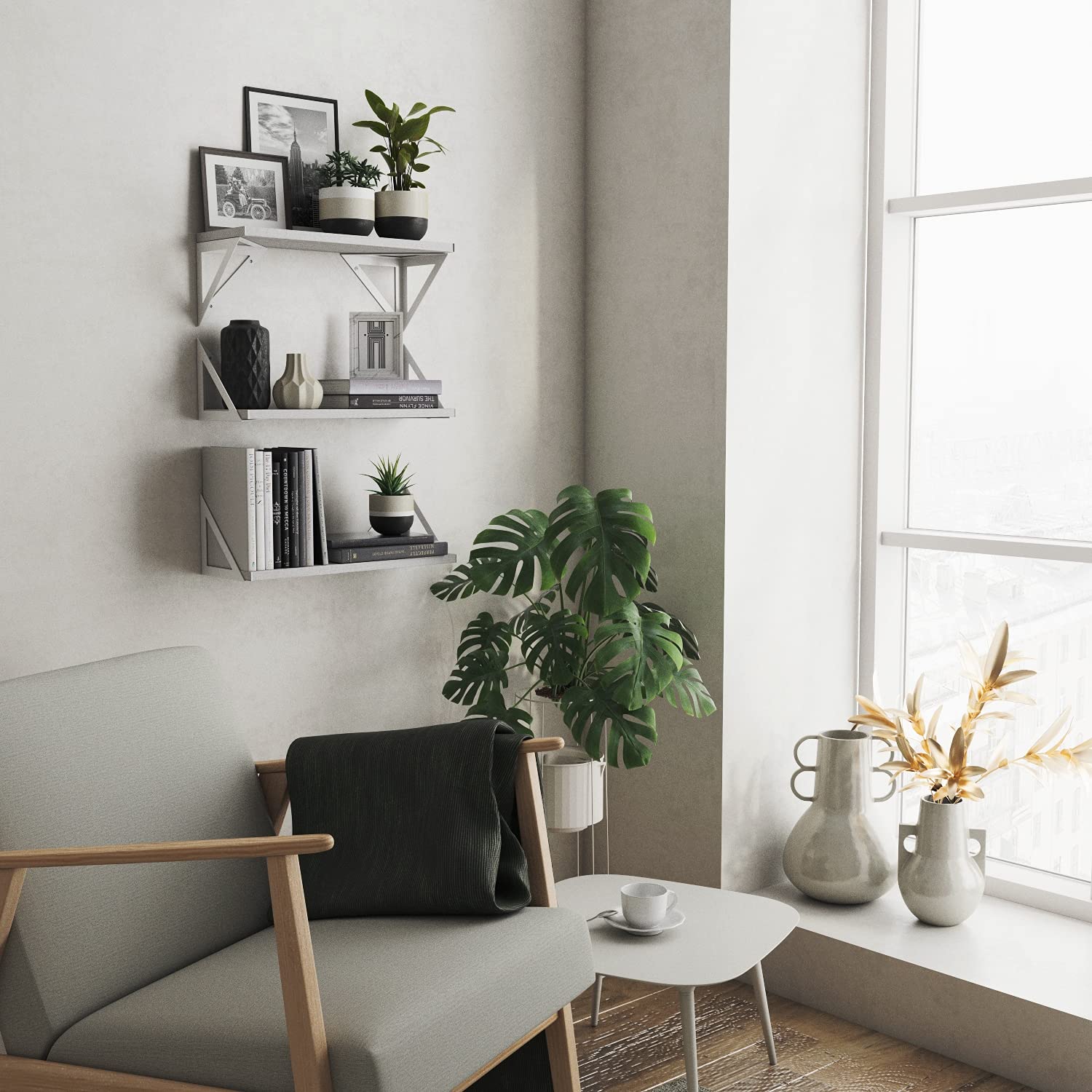 Wallniture Minori Washed White Floating Shelves for Wall Storage, Bathroom Shelves Over The Toilet Storage, Wood Wall Shelves Set of 3 with White Brackets