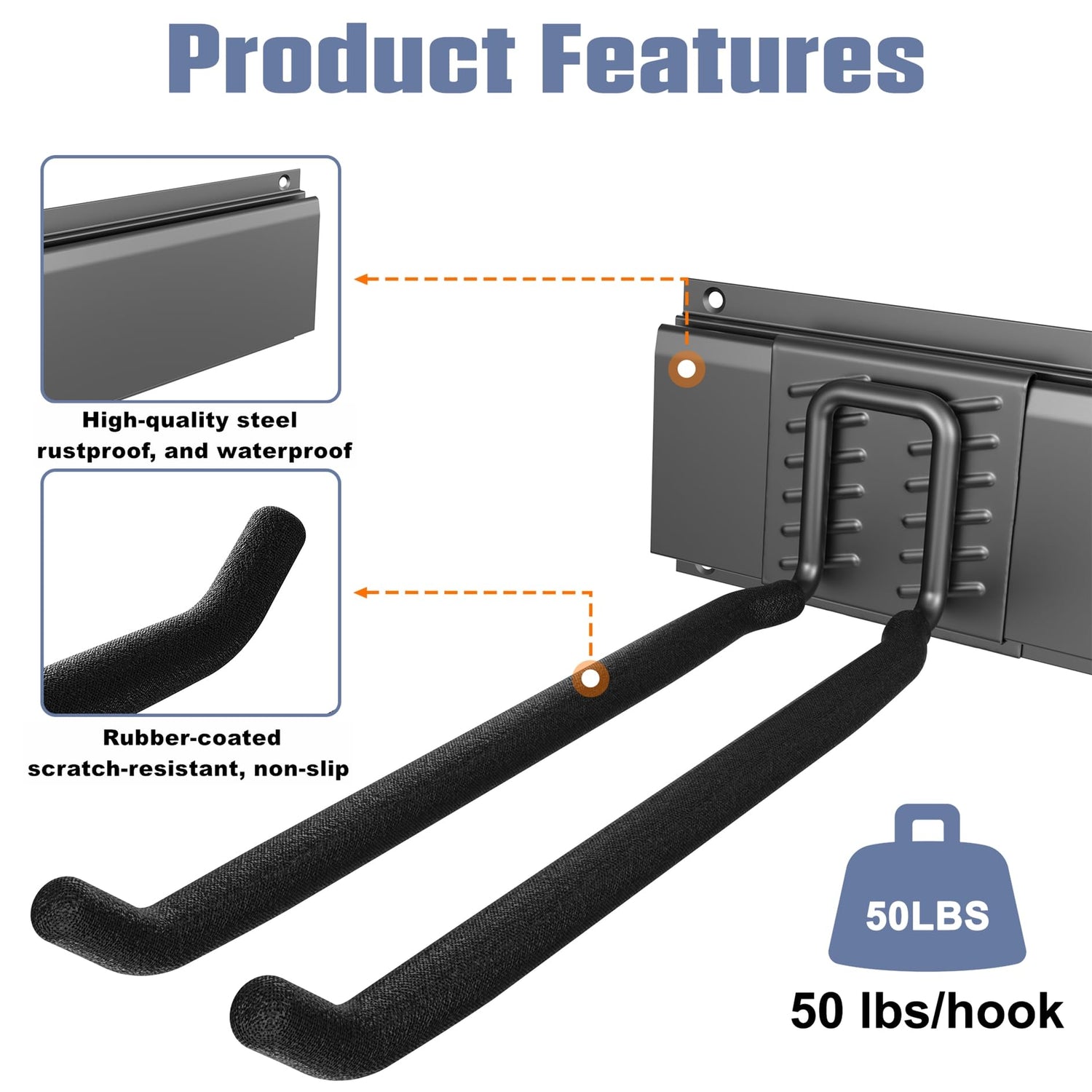 - Sturdy and Reliable Construction: Built from high-quality metal with a powder-coated finish, the durable tracks and hooks support up to 50 lbs per hook. Rubber-coated hooks prevent slipping and scratches
