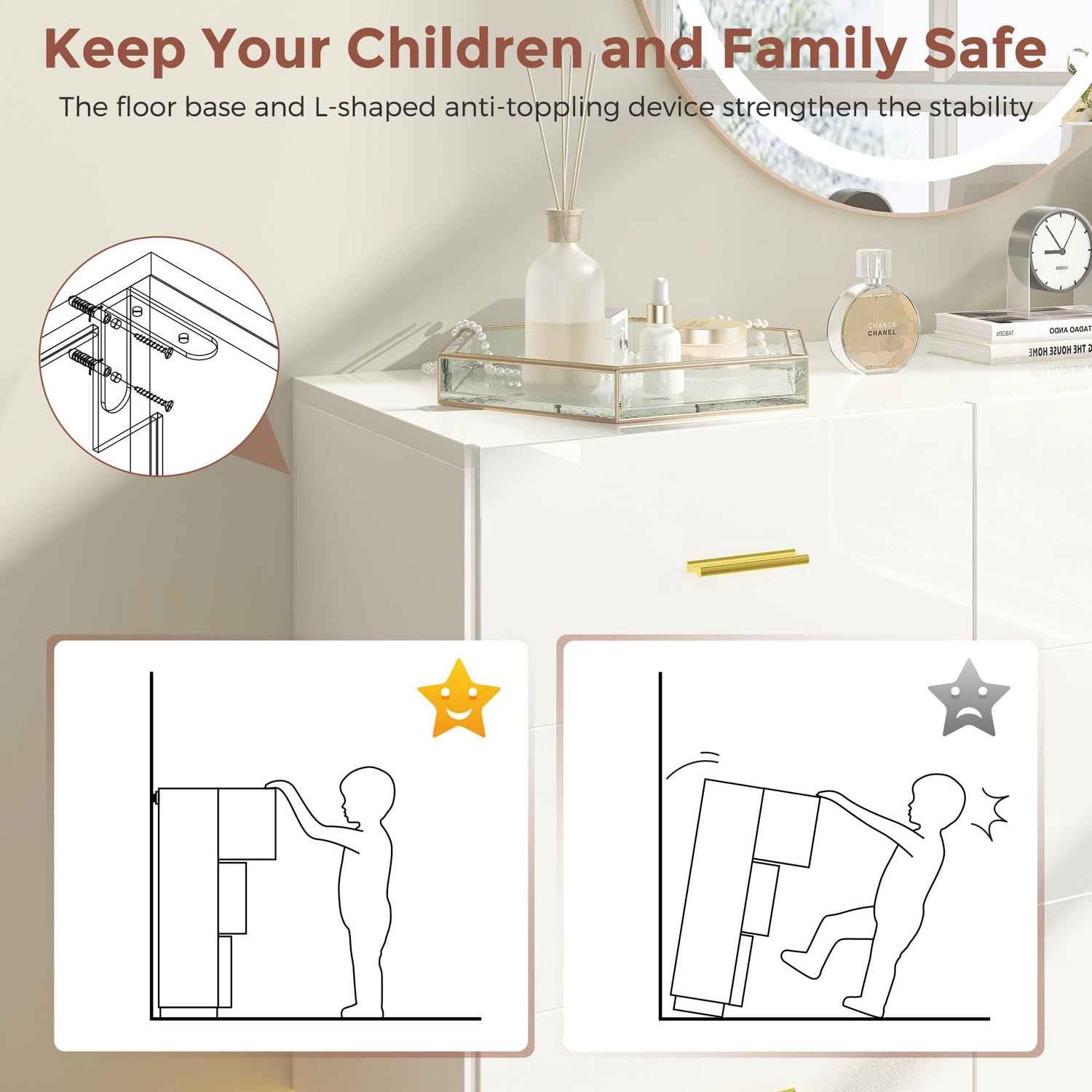 - 【STABILITY AND SAFETY】- The wooden dresser is constructed from high - quality materials including MDF board, and a durable iron frame, which ensure its durability. The anti - toppling device and adjustable feet are designed to provide excellent stability and safety, so you don't have to worry about it falling over or wobbling.