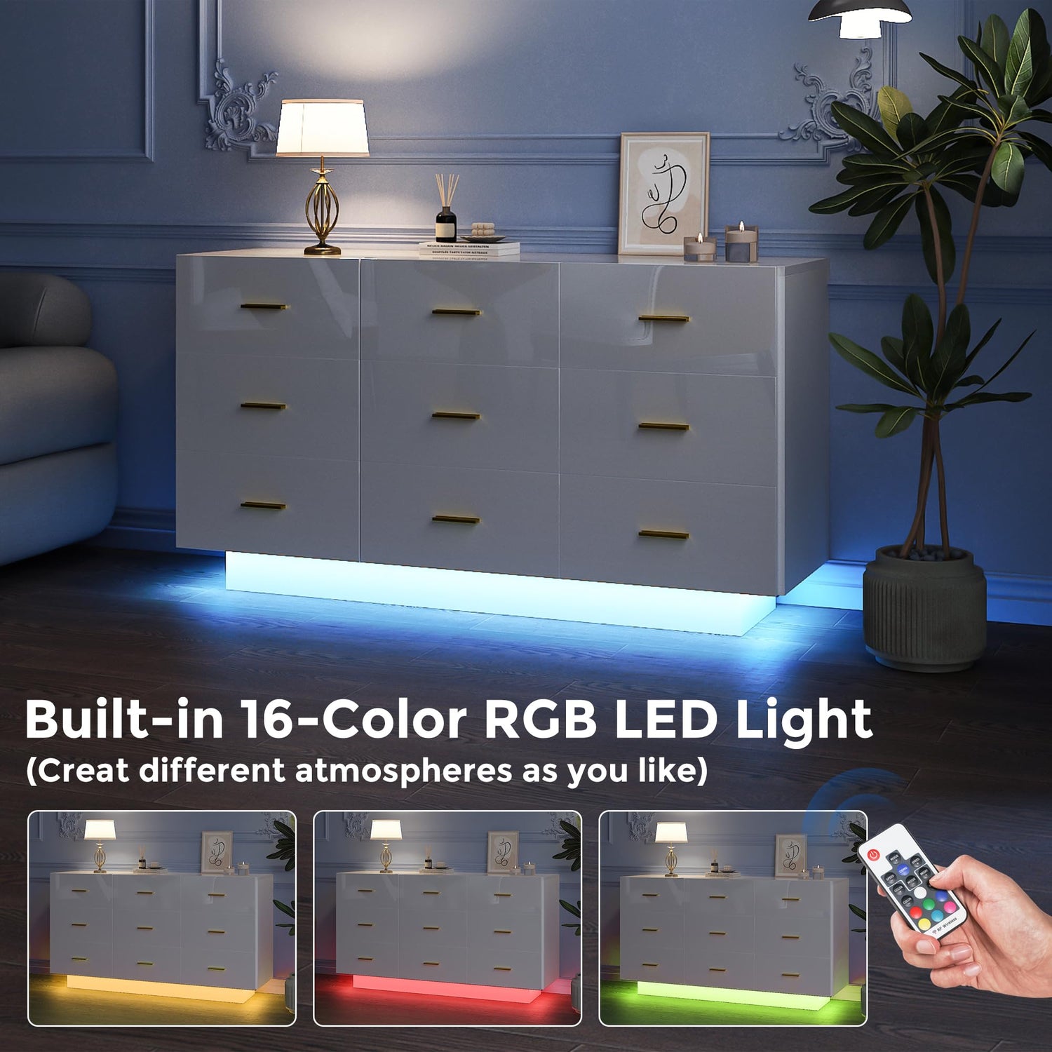 - 【DRESSER WITH LED LIGHT】- This 9 Drawer Dresser comes with a built - in LED lights, combining functionality with style. The LED lights offer you 16-color options, which can be easily controlled by the included remote, allowing you to set the perfect mood for any scene.