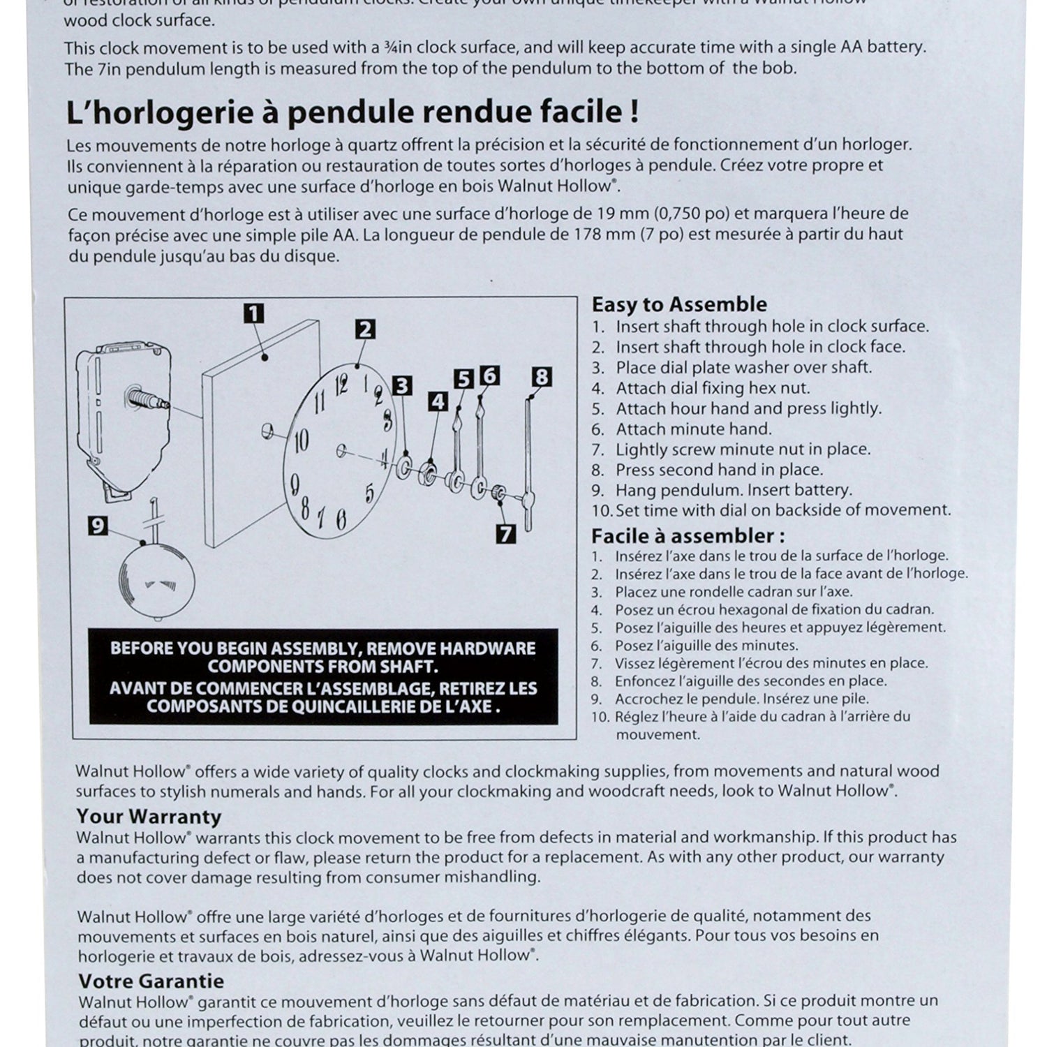 This pendulum movement will fit a surface that is up to 3/4-inches (19mm) thick. It is ideal to repair a treasured clock or even to design your own pendulum clock to decorate your home or as a gift. Almost anything you can drill a 3/8-inch (9.5mm) diameter hole in, can be turned into a clock if there is room for the pendulum. The most important thing is to select a movement that closely matches the thickness of the piece you are using to make a clock; this one has a shaft length of 3/4-inches (19mm) and so will fit a surface up to that thickness. The minute hand is approximately 2-inches (50.8mm) long, the hour hand is approximately 1.25-inches (50.8mm) long and the Pendulum is 7-inches (177.8mm) long. The motor swings the pendulum in a natural looking arc. The quart movement requires a AA battery which is not included which also. Full assembly instructions are supplied.