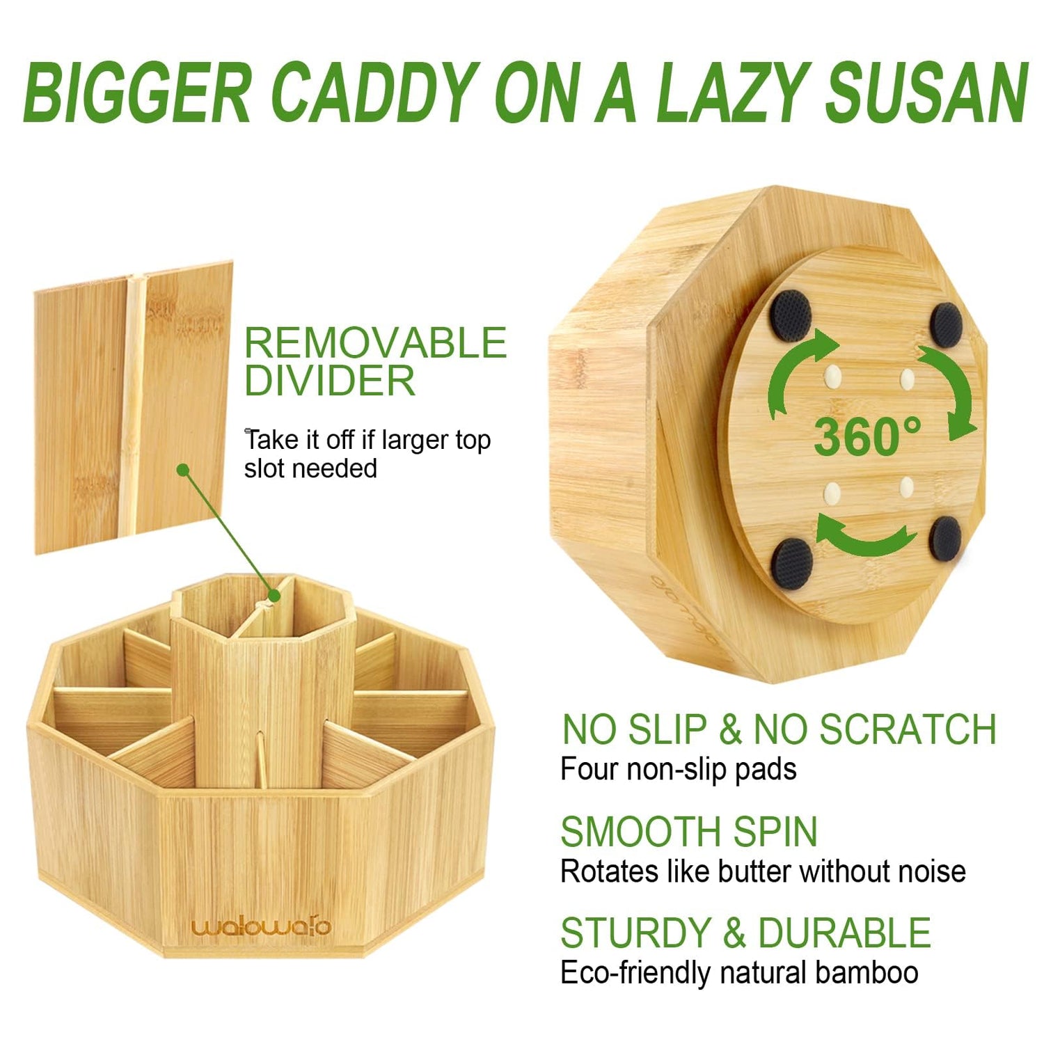 - BAMBOO PRODUCT - You will like the natural bamboo design. With its natural color and beautiful texture design, the rotating caddy fits for different style of decor. Also, available stained or painted if you prefer to.