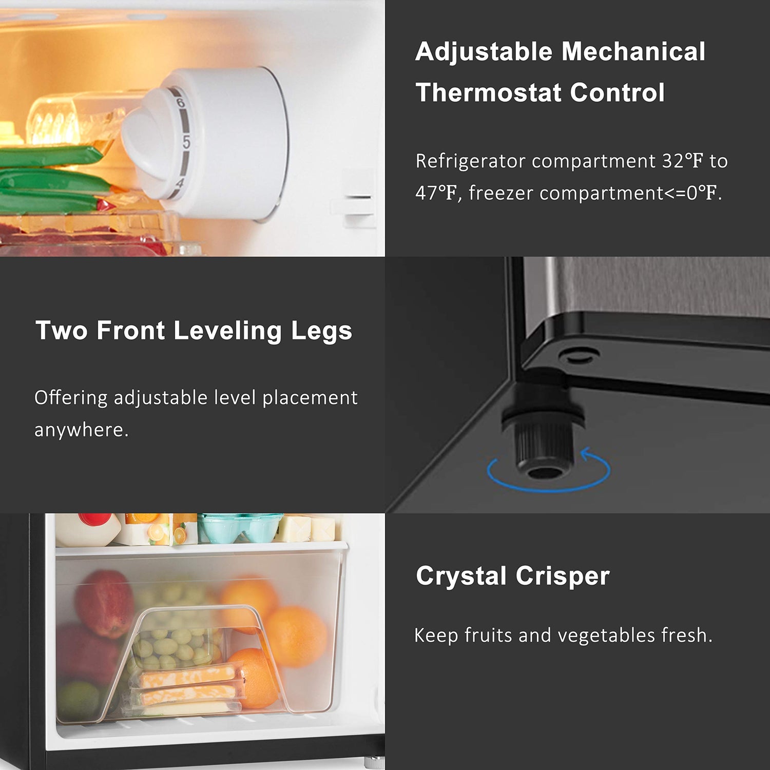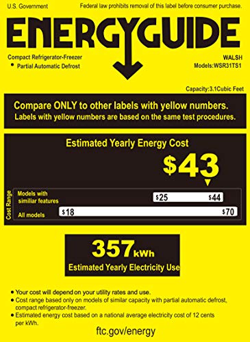 • ADJUSTABLE MECHANICAL THERMOSTAT CONTROL: Walsh refrigerator can be controlled manually with the control dial from 0-7, you can turn the knob to set the temperature you want. And the temperature range for refrigerator compartment is 32℉ to 47℉, freeze compartment<=0℉.