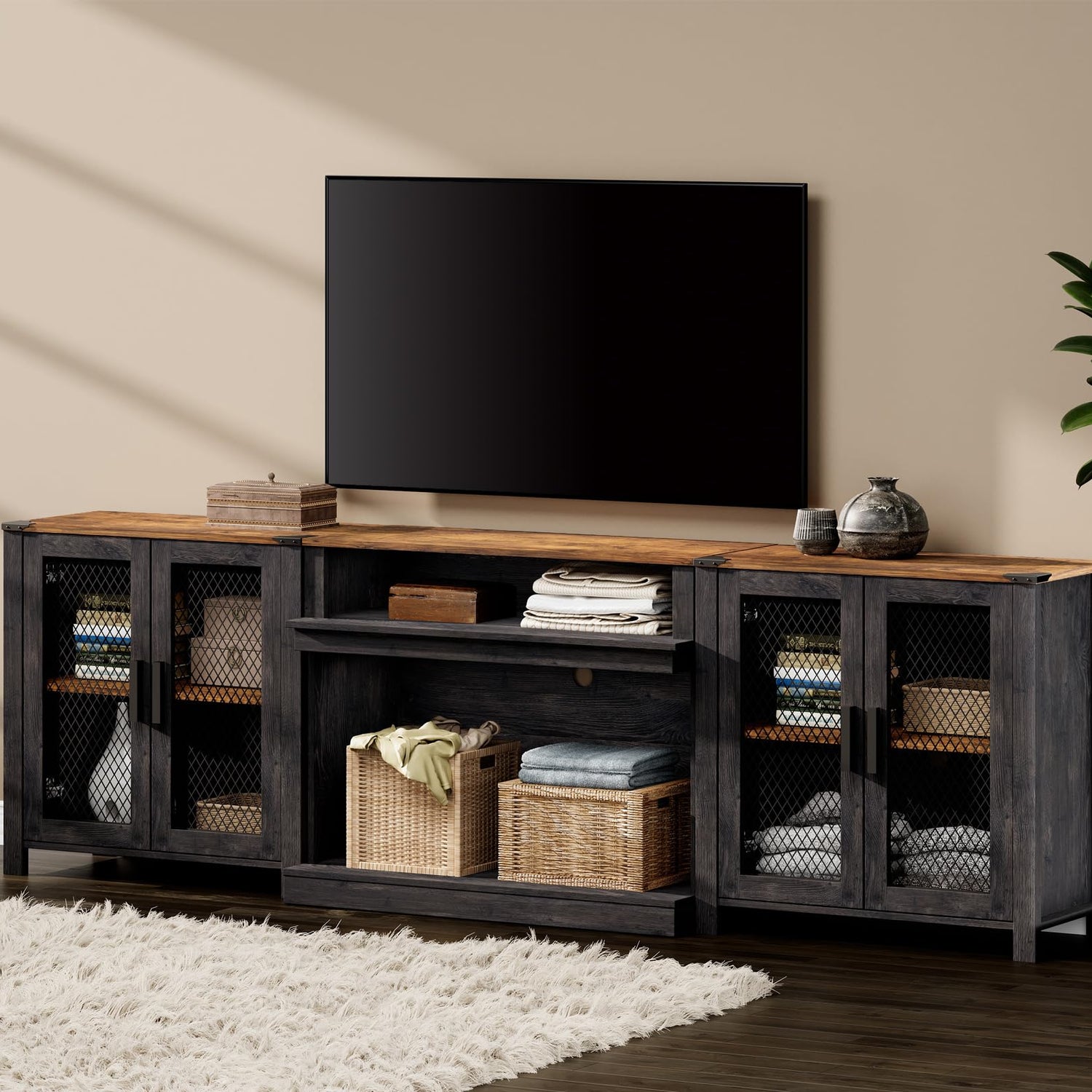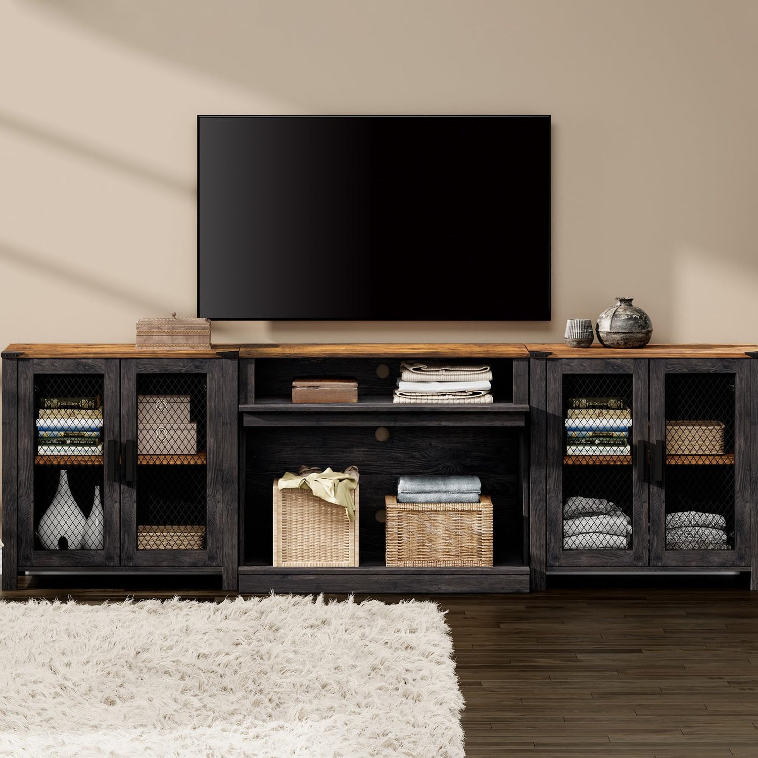 WAMPAT 2 in 1 TV Stand Set for 100 inch TV, Farmhouse Entertainment Center with 4 Mesh Door and Open Storage Shelves, Wood Media TV Console Table for Dining and Bedroom,Dark Walnut and Black