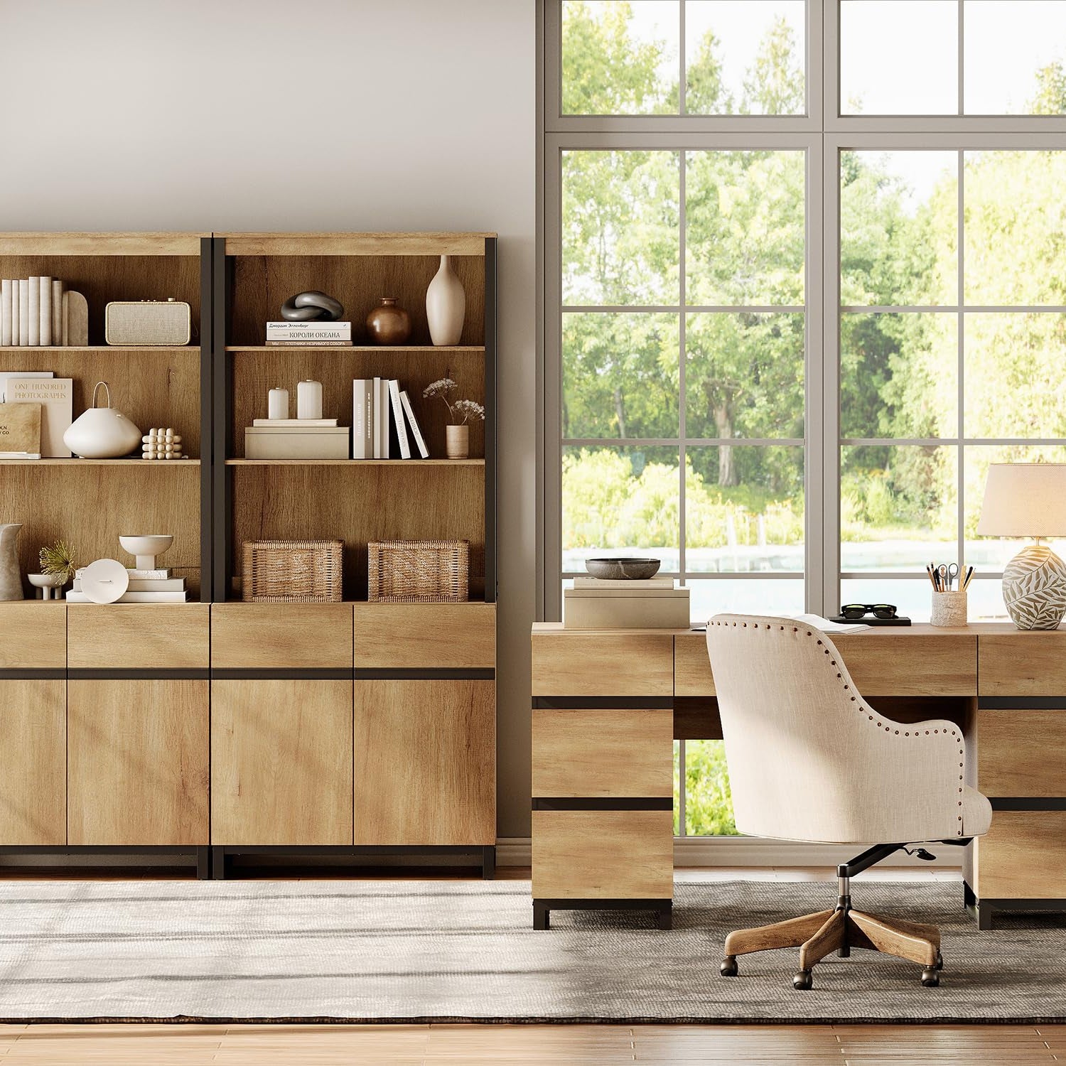 WAMPAT 3 PCS Modern 72" Tall Bookcases with Metal Base and Adjustable Shelves, Library Book Shelf with Storage Cabinet and Open Book Shelfs, Wood Bookshelves for Home Office, Living Room, Oak