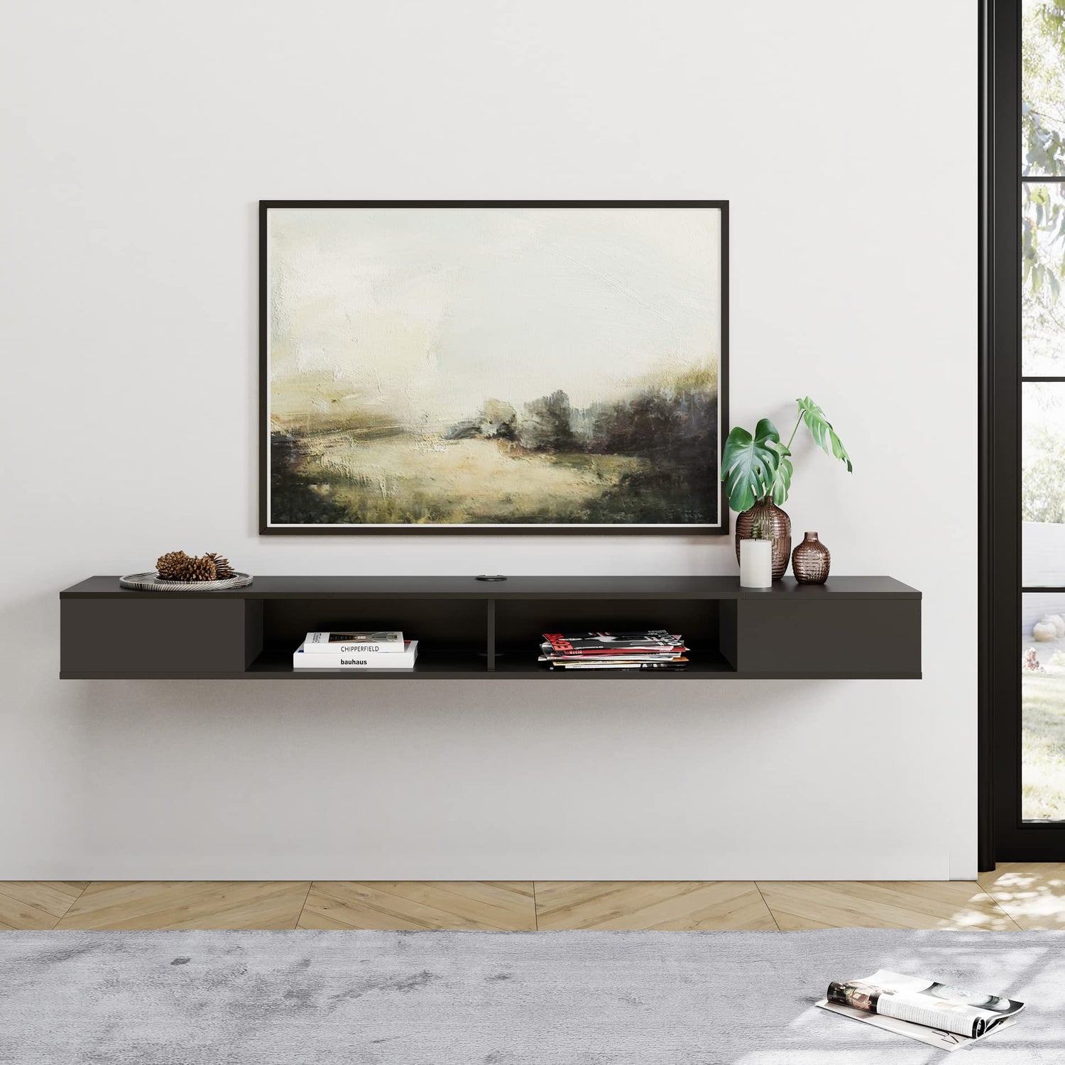 - 【Modern Floating TV Stand】 Made of solid MDF board with rich black finish which make the floating media stand beautiful, waterproof, wear-resistant and easy to clean. It is worth mentioning that wall mount tv stand frees up from floor, greatly expand floor space and suitable for small room.