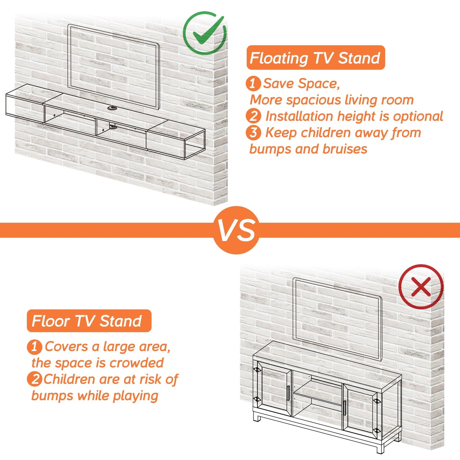 - 【Easy To Assemble】Our floating tv console comes with standard wall-mounted installation accessories and labeled boards. With clear assemble video in our listing, it is easy to assemble and follow. If you have any question about our item, you can contact with us.