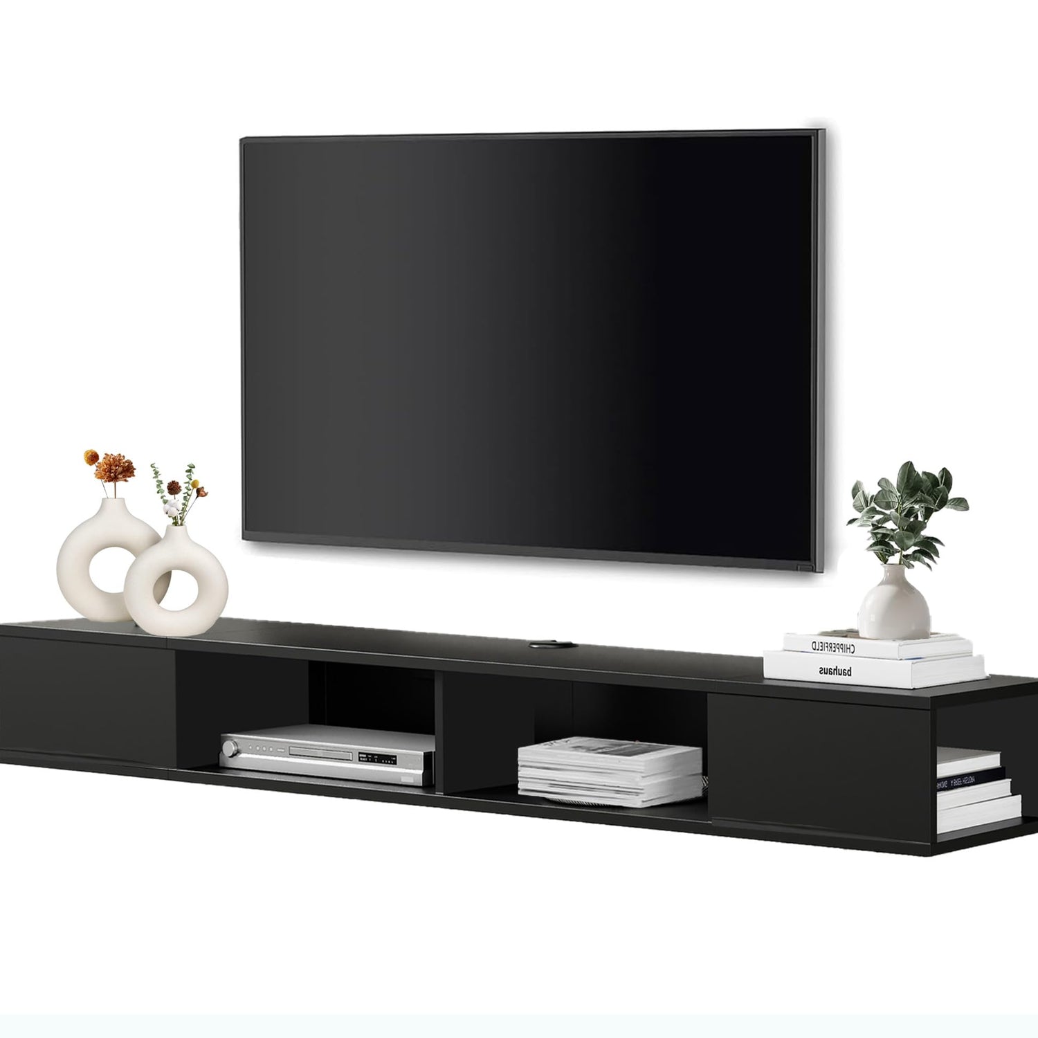- 【Modern Floating TV Stand】 Made of solid MDF board with rich black finish which make the floating media stand beautiful, waterproof, wear-resistant and easy to clean. It is worth mentioning that wall mount tv stand frees up from floor, greatly expand floor space and suitable for small room.
