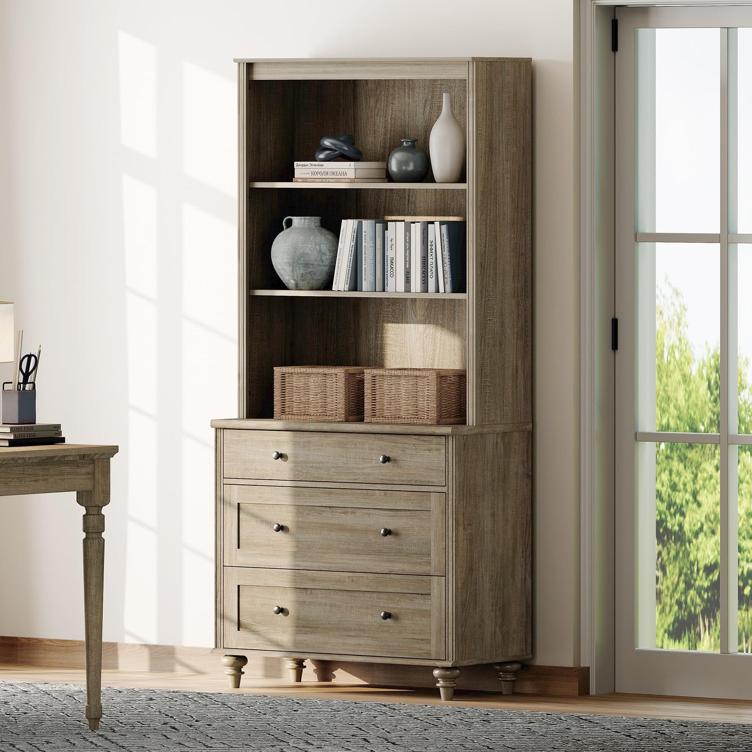 - 【Premium Material& Sturdy Structure】The wash gray bookcase with doors crafted from optimal MDF, built to withstand the challenges of long-term use. The solid wood gourd legs greatly increases stability and weight capacity, the thickened tabletop can easily hold up to 152 lbs.The smooth waterproof surface of the bookcases is convenient to clean with a soft damp cloth to facilitate your daily cleaning work.