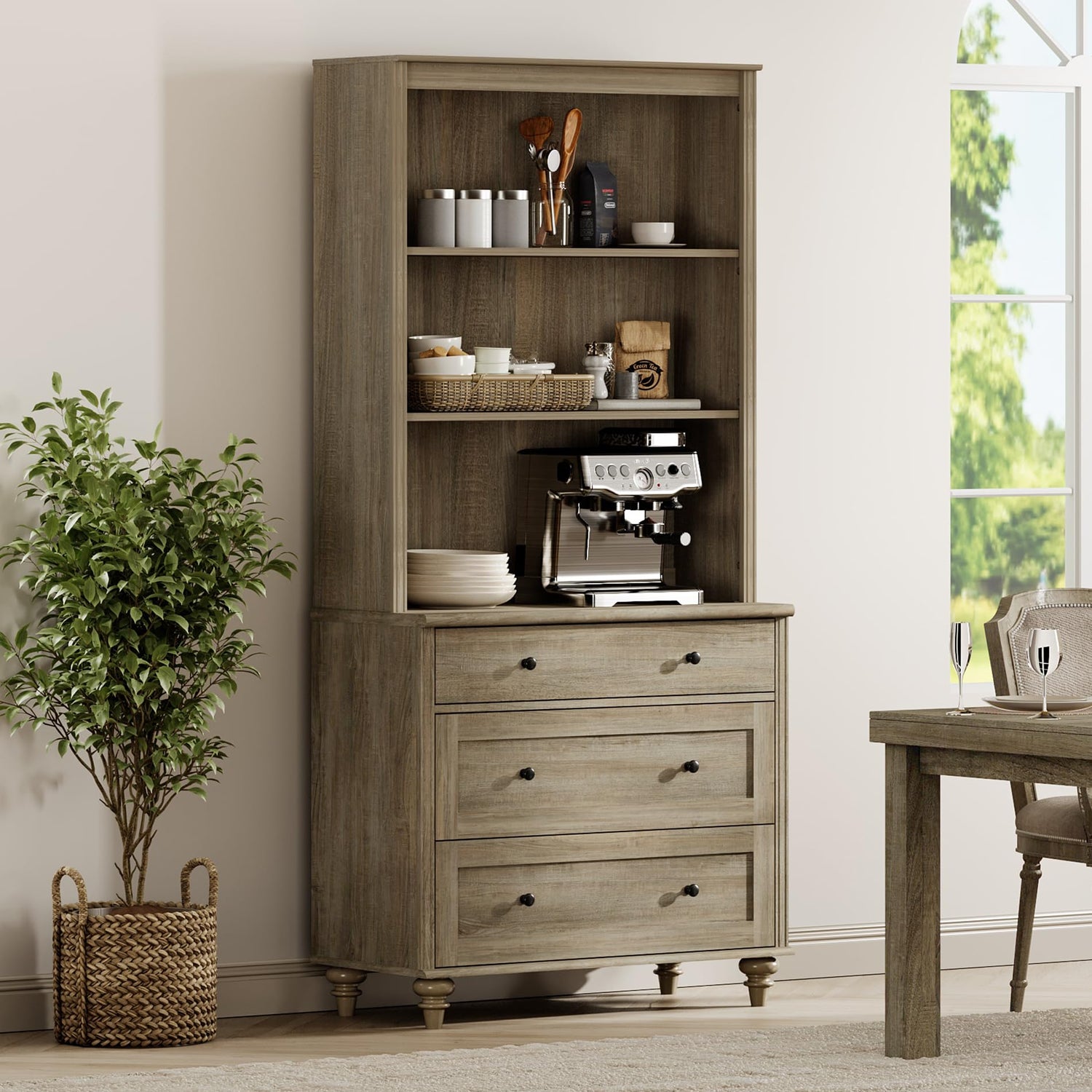 - 【Farmhouse Bookshelf & Multiple Use】Featuring wash gray wood surface and vintage gourd shaped leg design looks modern and elegant. Well matches with your farmhouse style home decor. making it a perfect fit for living rooms, bedrooms, home offices, and kitchens. Not only be a bookcase or a plant shelf but also a standing storage shelf to meet your different needs. Make your space neat, tidy, and also in great style.